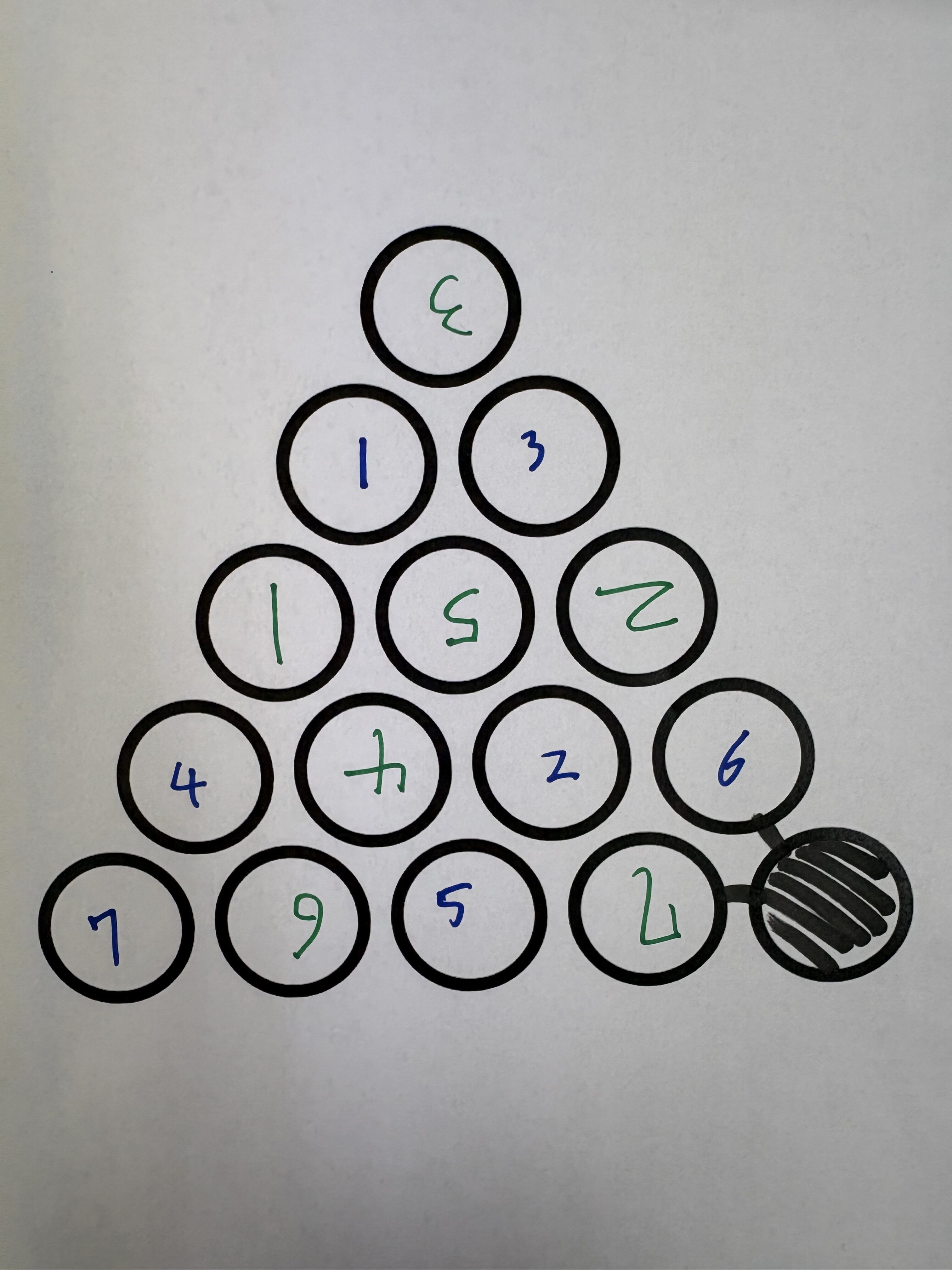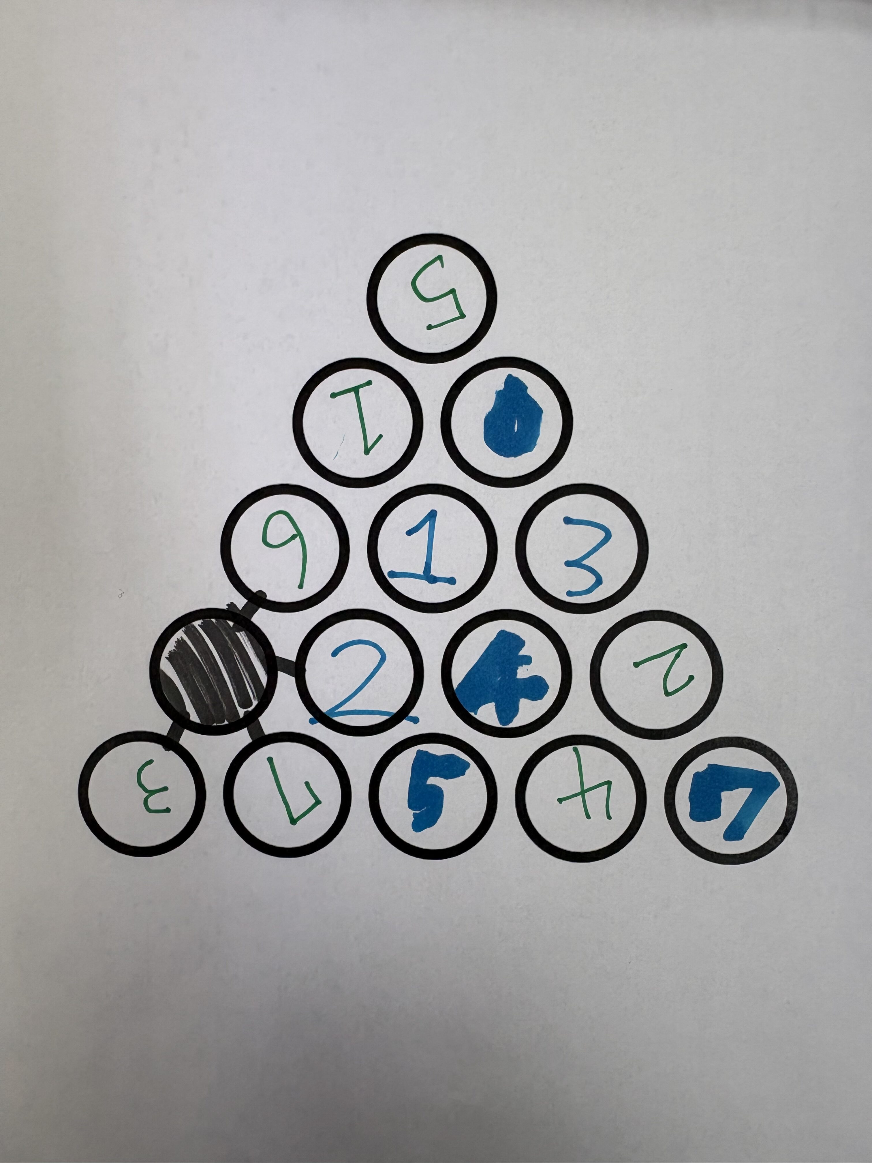 円がピラミッド状に並んだ盤面を使って行う、2人対戦のゲームです😊