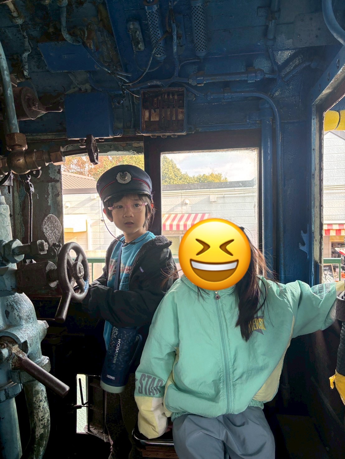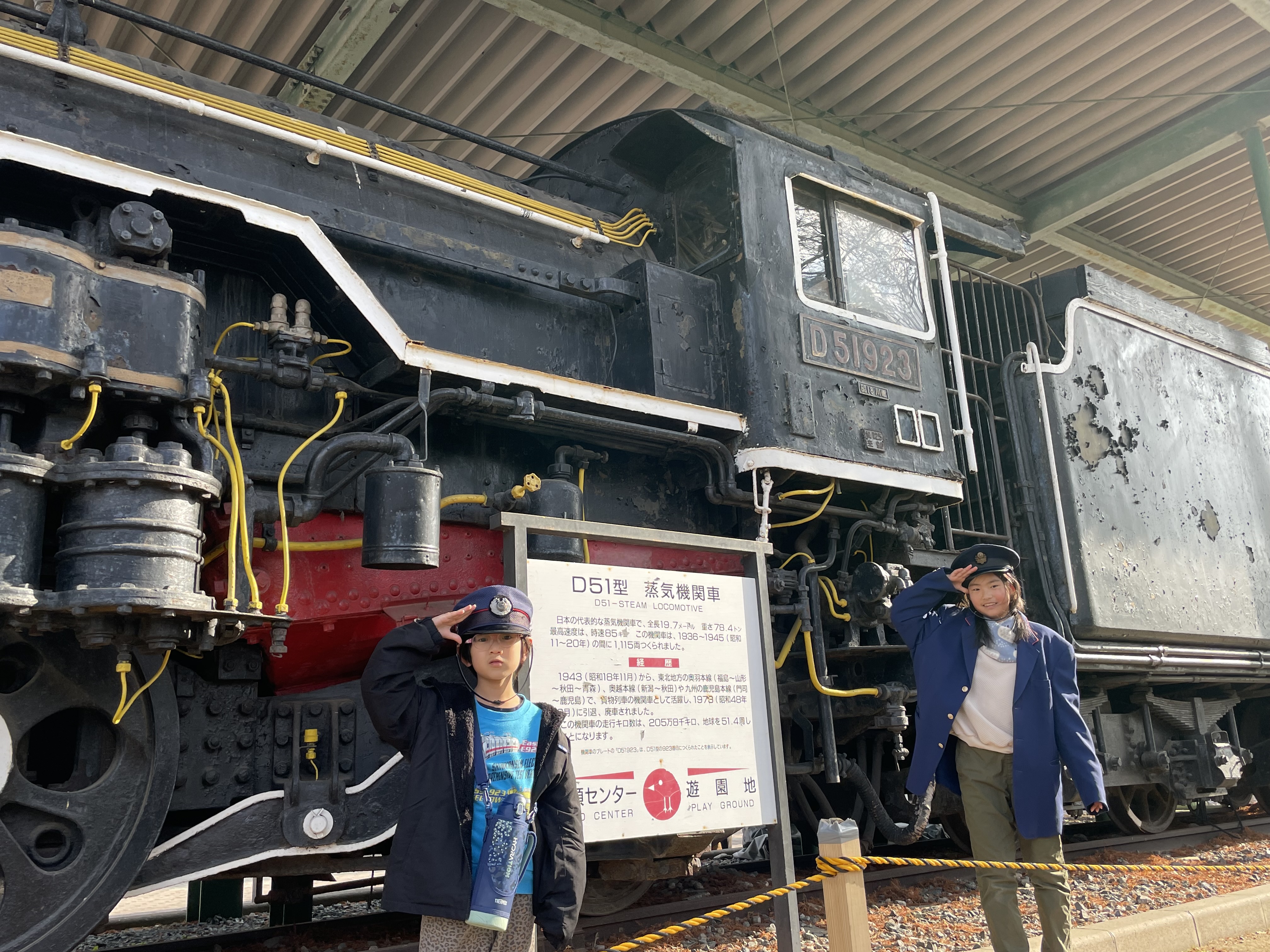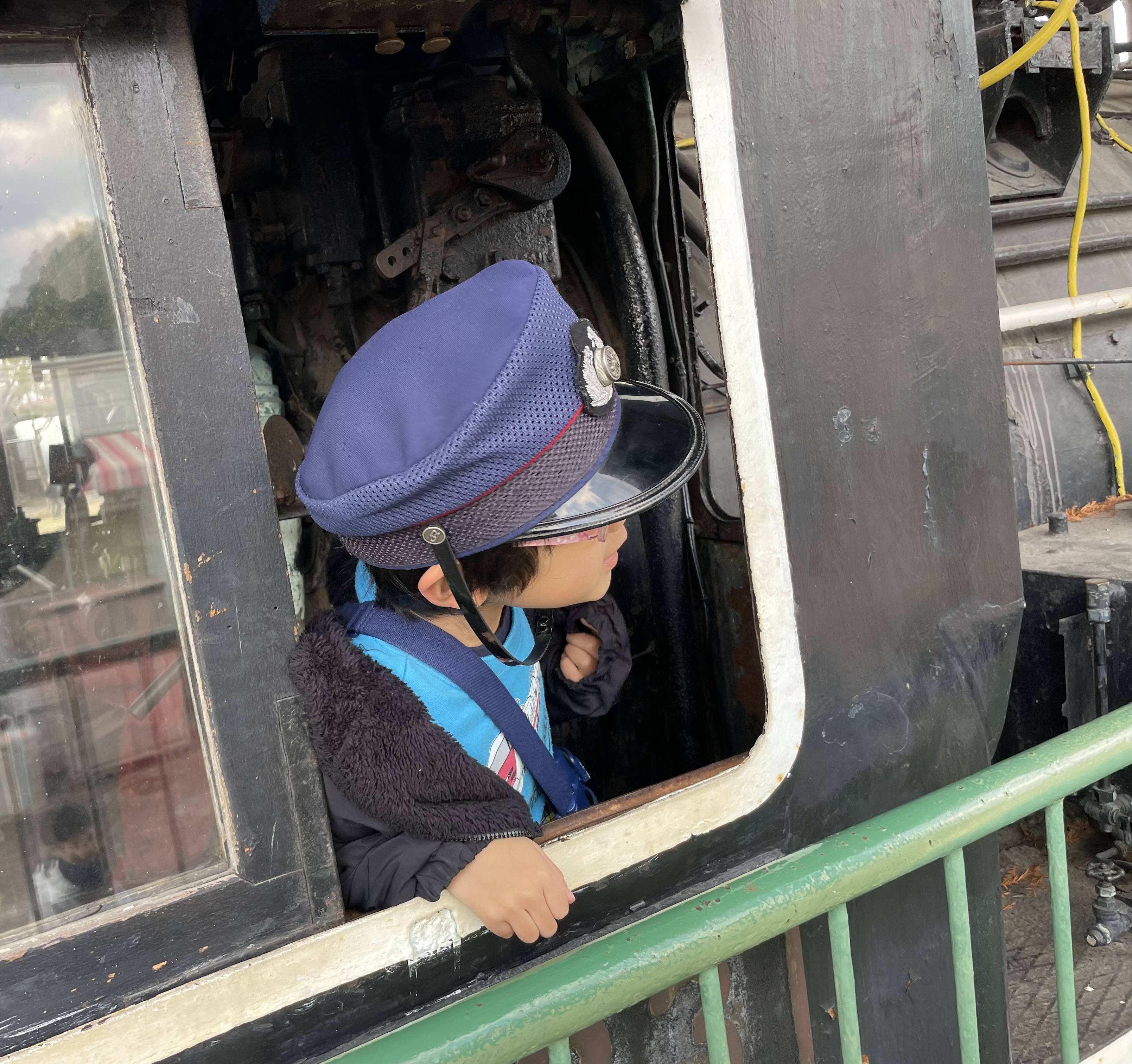 センター内には蒸気機関車の中に入れるブースもあり春日事業所のお友達と帽子や制服を借りて車掌さん体験もできました✨👏