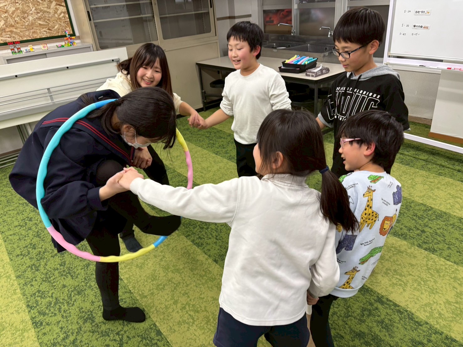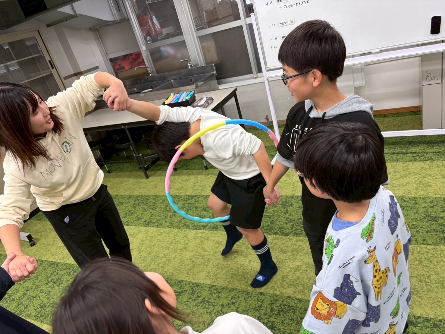 みんなで手を繋いで輪になり、身体にフープを通してぐるっと一周させよう!🌀