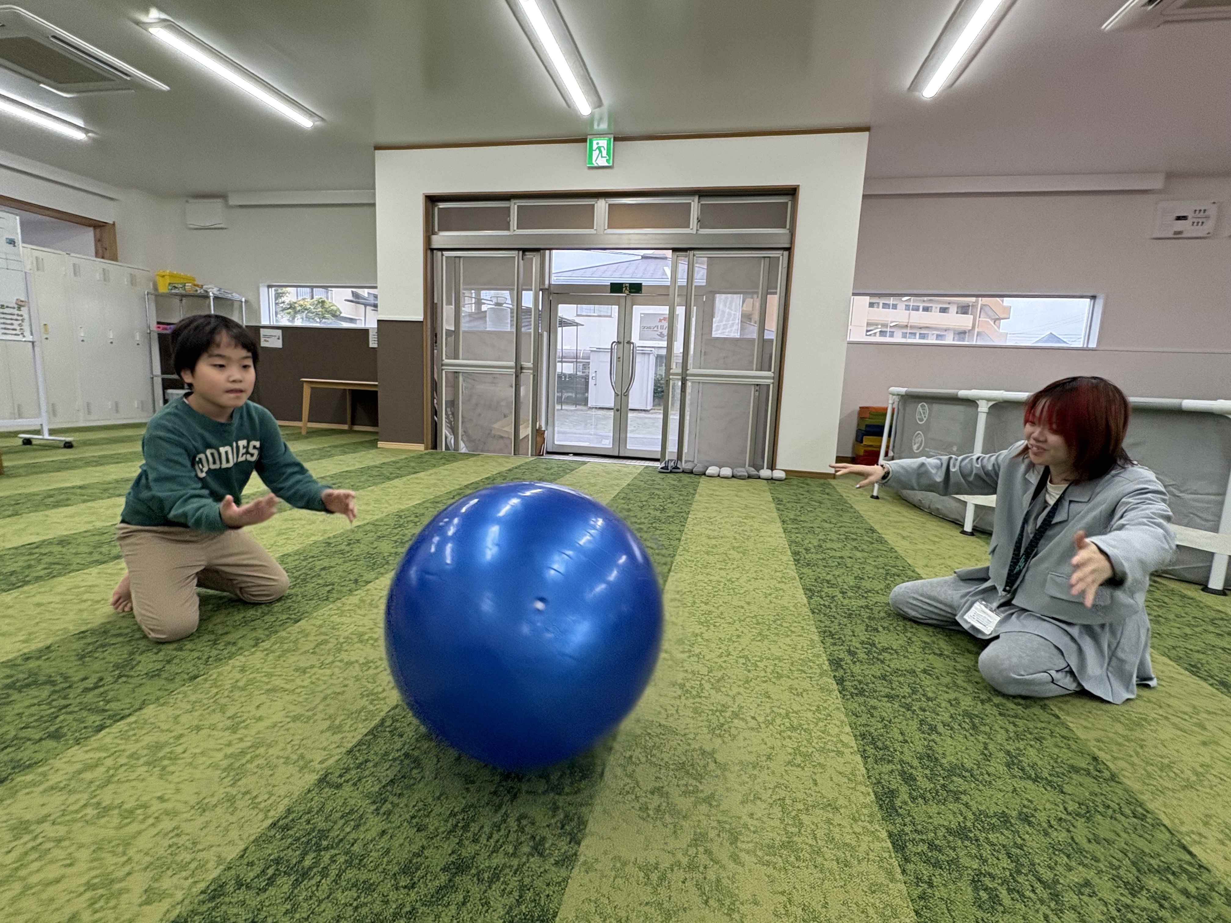 相手をしっかり見て、相手がいる方向に優しく転がす練習など