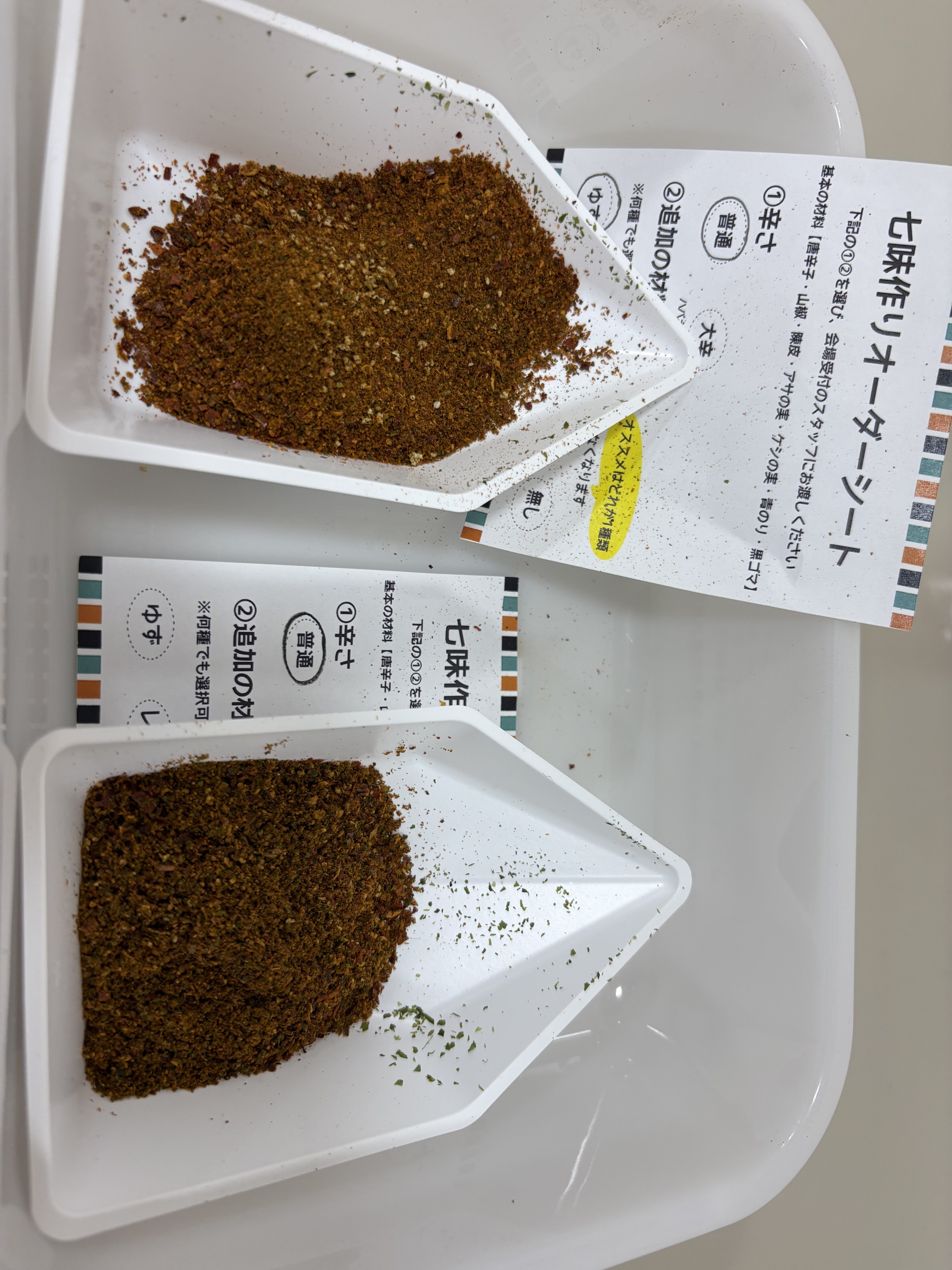 辛さや風味を自分で選んで、オリジナルの七味唐辛子が作れます😋