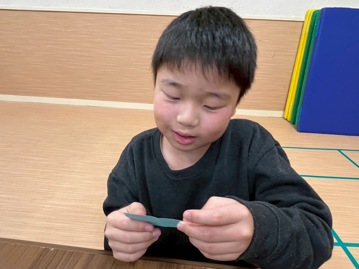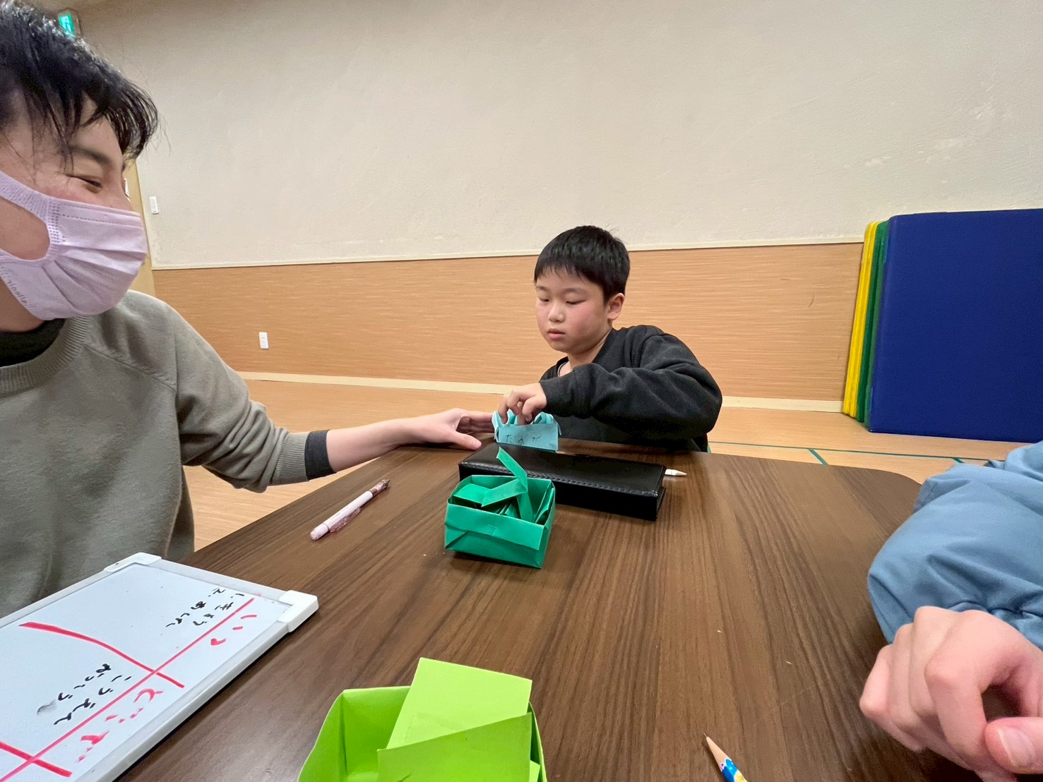 ①4色🟥🟨🟪🟩の紙を配布して、スタッフが言った色の紙に、言った言葉、例えば「いつ」を書いて下さいと言われたら、現在、過去、未来いつでもいいので1枚に一個を書く、それを…同じ色の箱に折って入れる…それを4回繰り返し行う