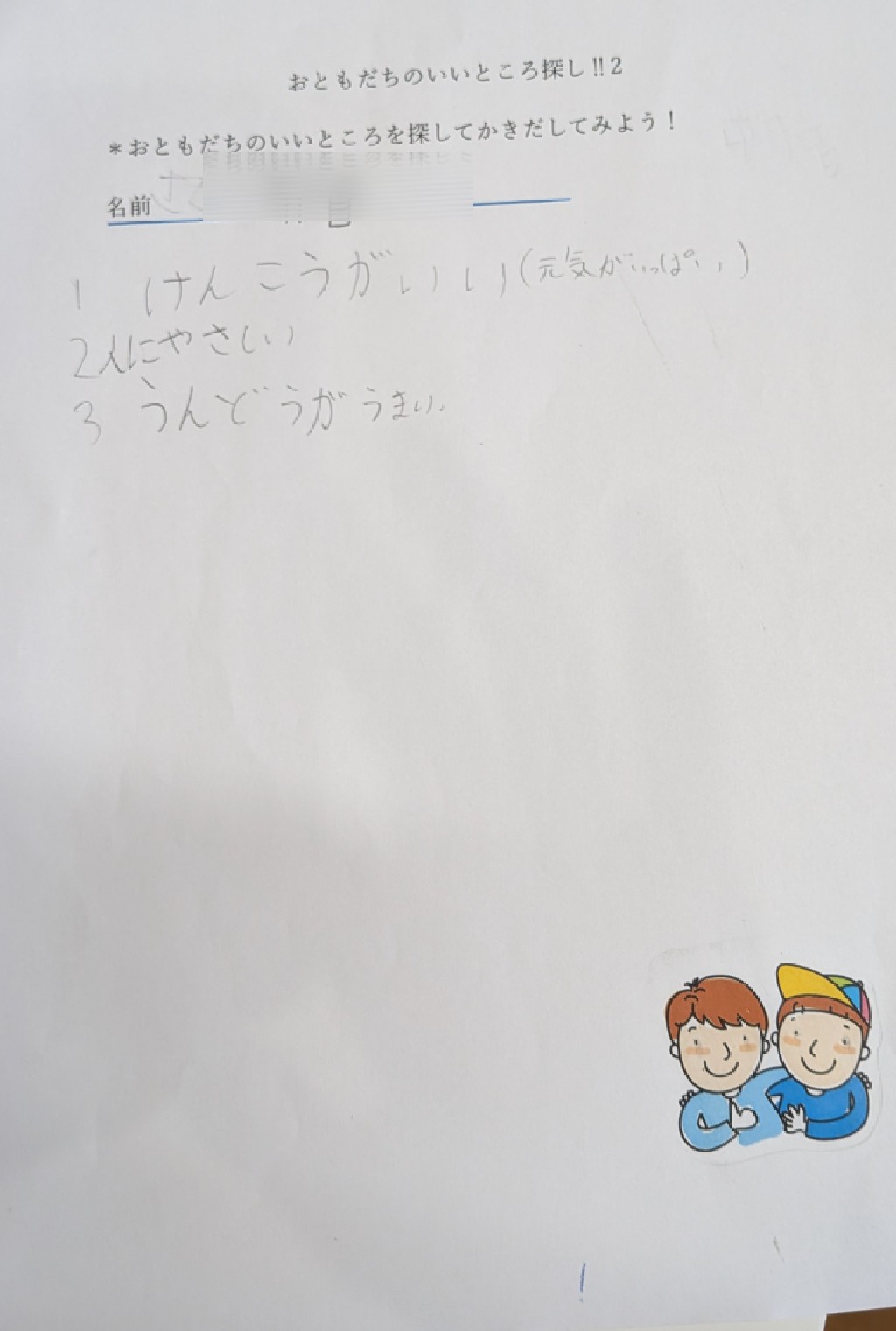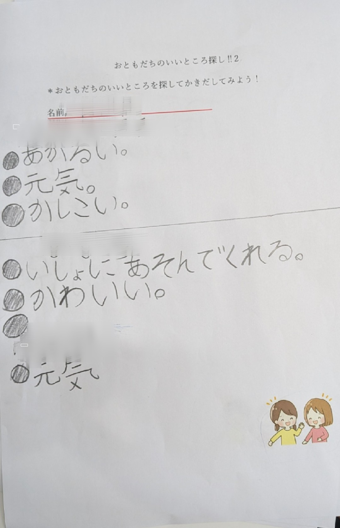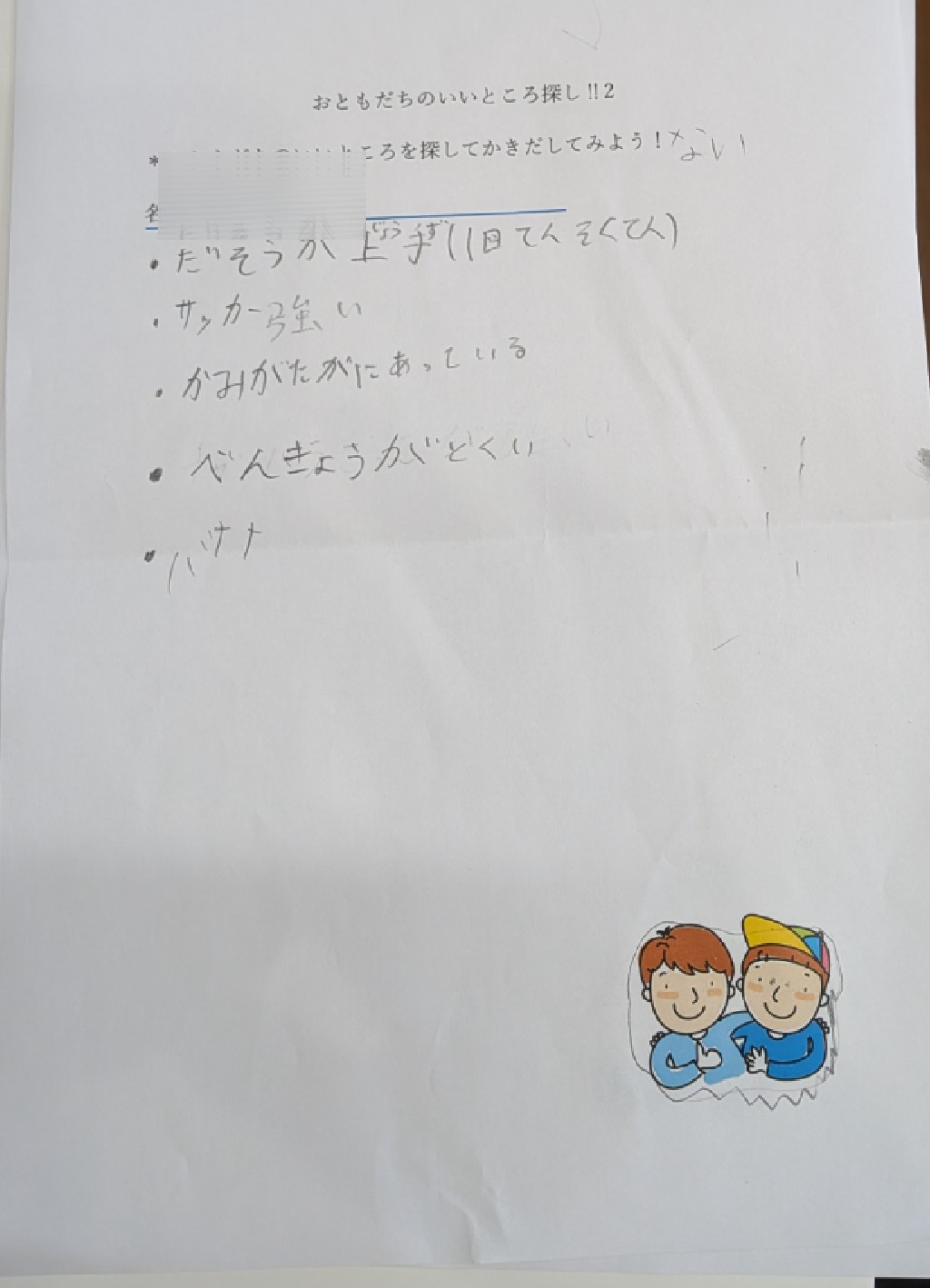 スタッフが再度説明しながら、友達の良い所を紙に書いてました😊