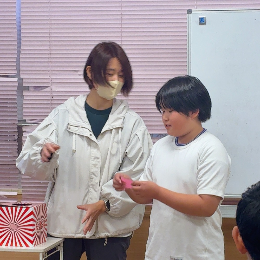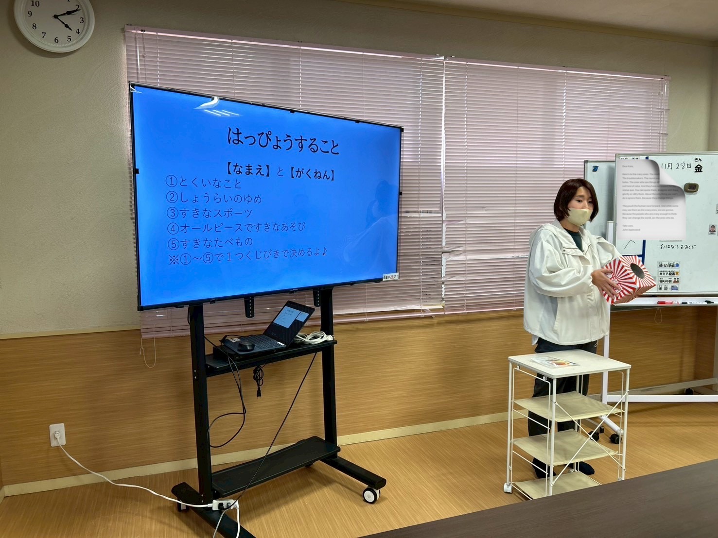 名前や学年以外に「好きなスポーツ」や「将来の夢」など5つのテーマの中から1つくじ引きで引いた内容をみんなの前で発表するものとなっています😊