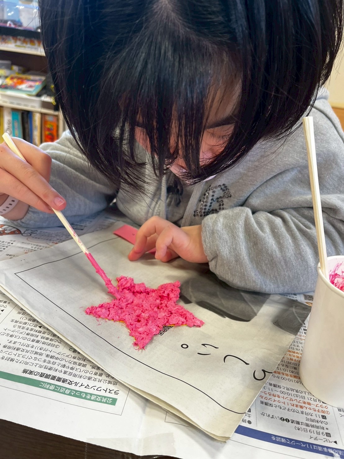 割り箸を使って、星のとんがった部分にもしっかり塗っていくよ🧸✨