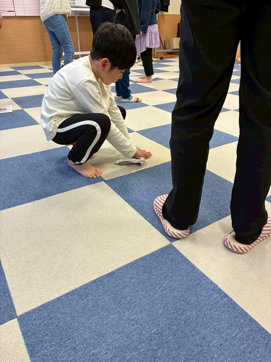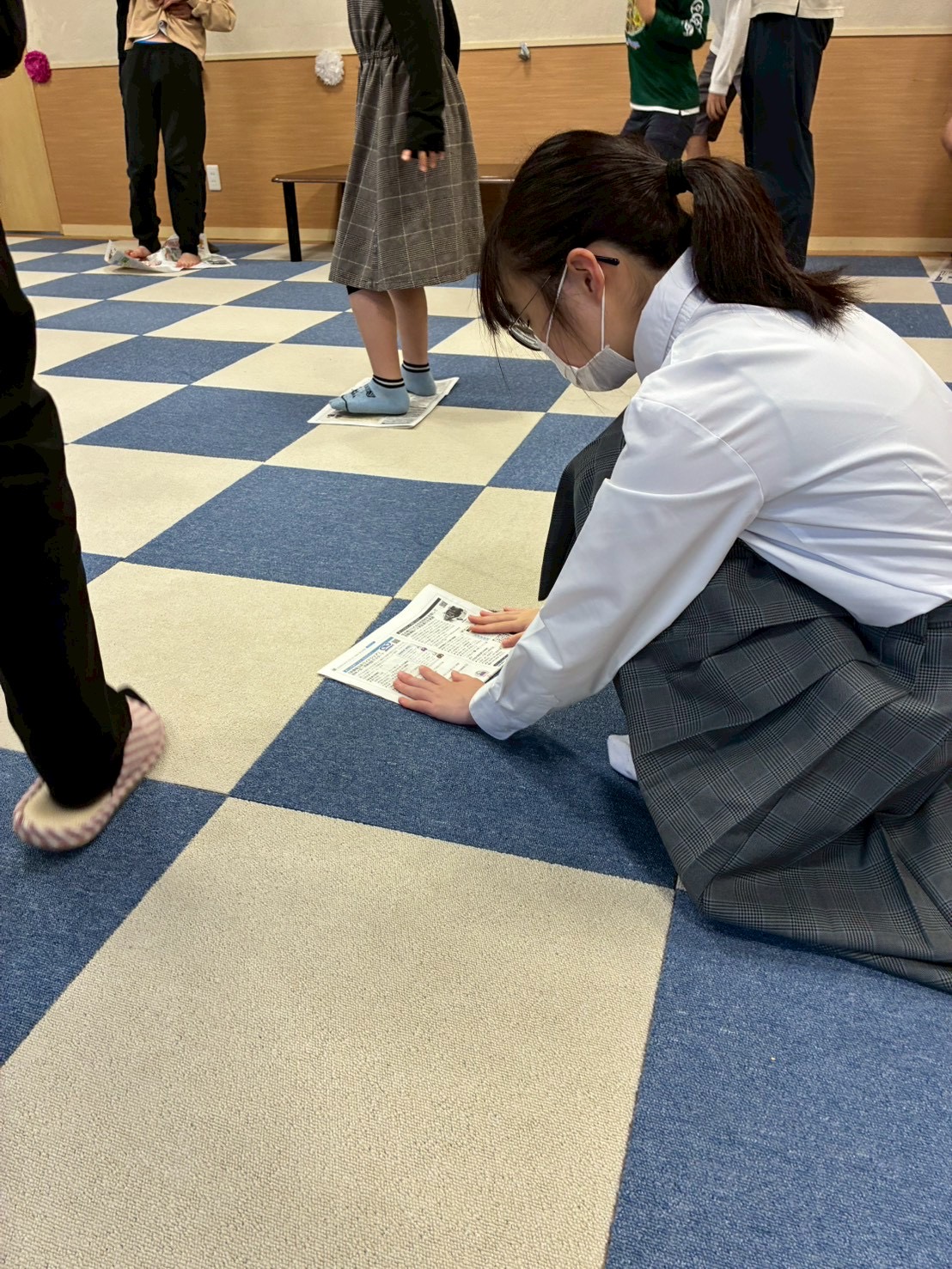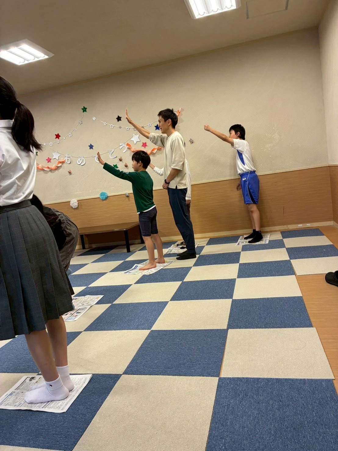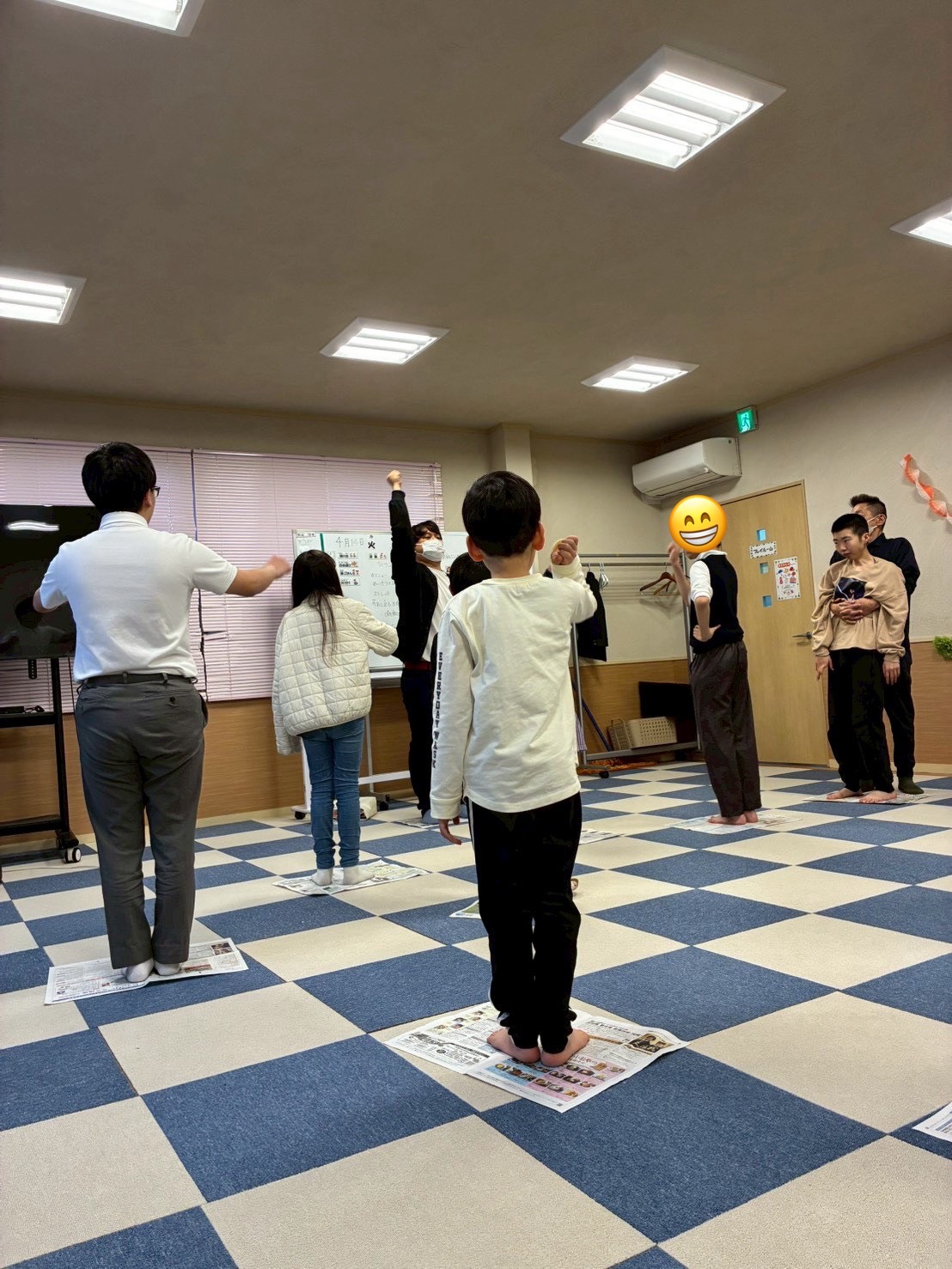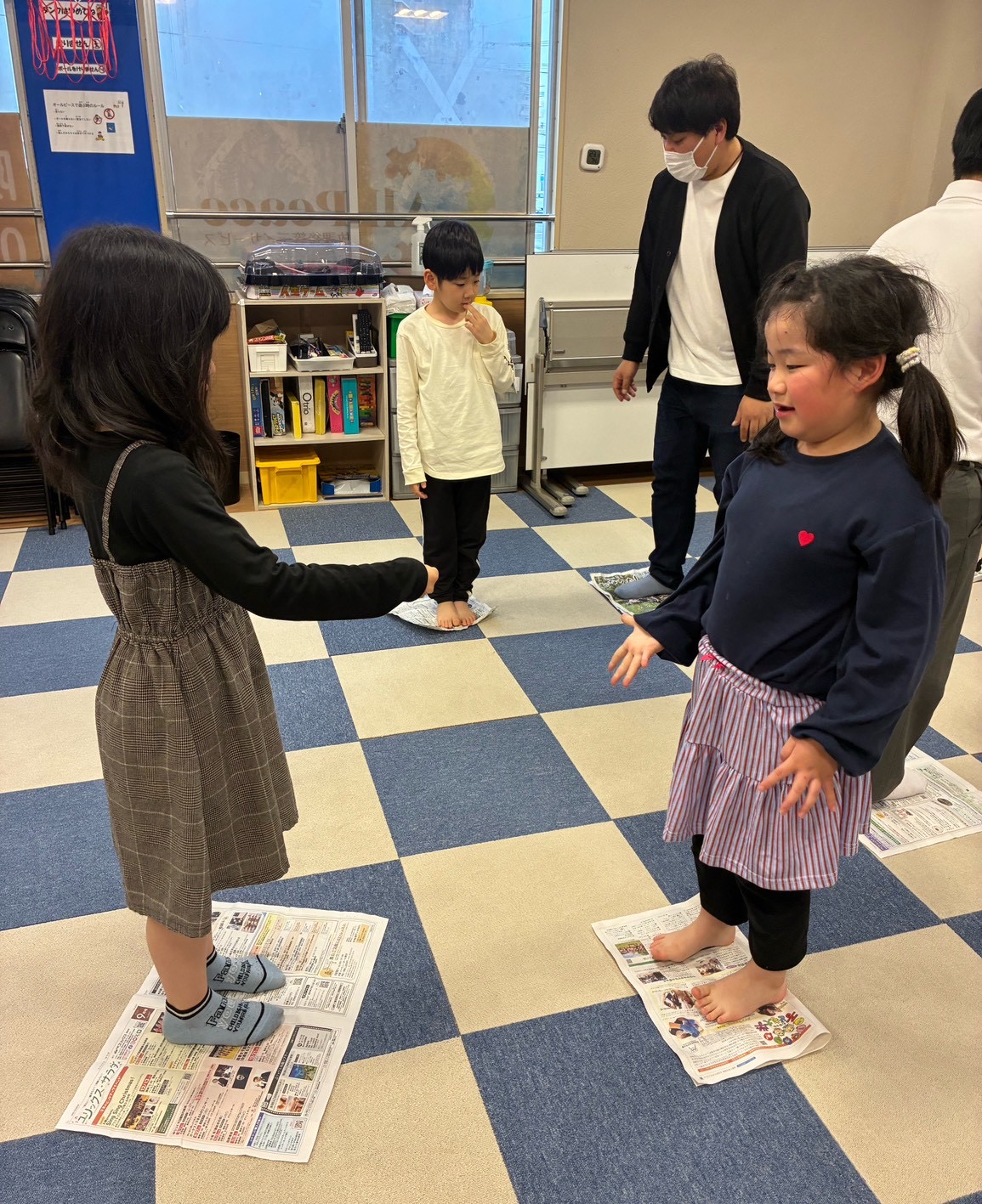 新聞紙の面積が小さくなったら自然と先程やった片足立位の形になりながらバランスを取る様になり皆んな必死にバランスを取りながら取り組めていました☺️👏