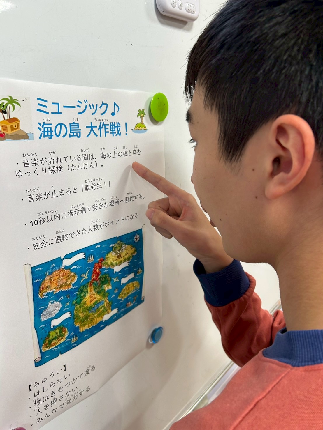 「黄色と青以外の島へ!」という指示に、「じゃあ緑だ!」「急ごう!」と素早く判断✨ さらにレベル3では“お話なし”のルールに挑戦。声を出さずに、指さしやジェスチャーだけで意思疎通を図りながら協力します🤫👉 それでも子どもたちはしっかり考え、工夫しながらミッションをクリアしていきました。