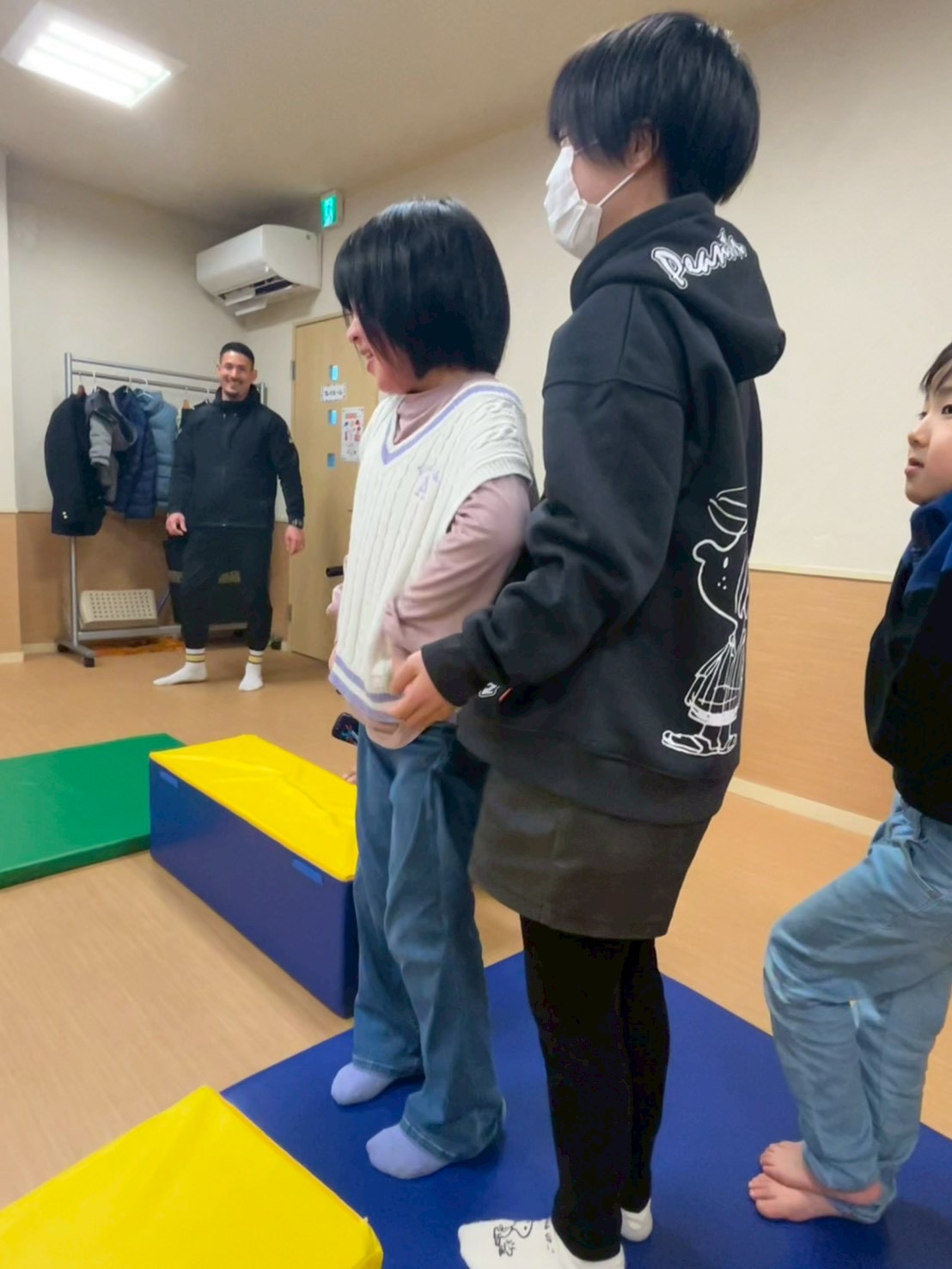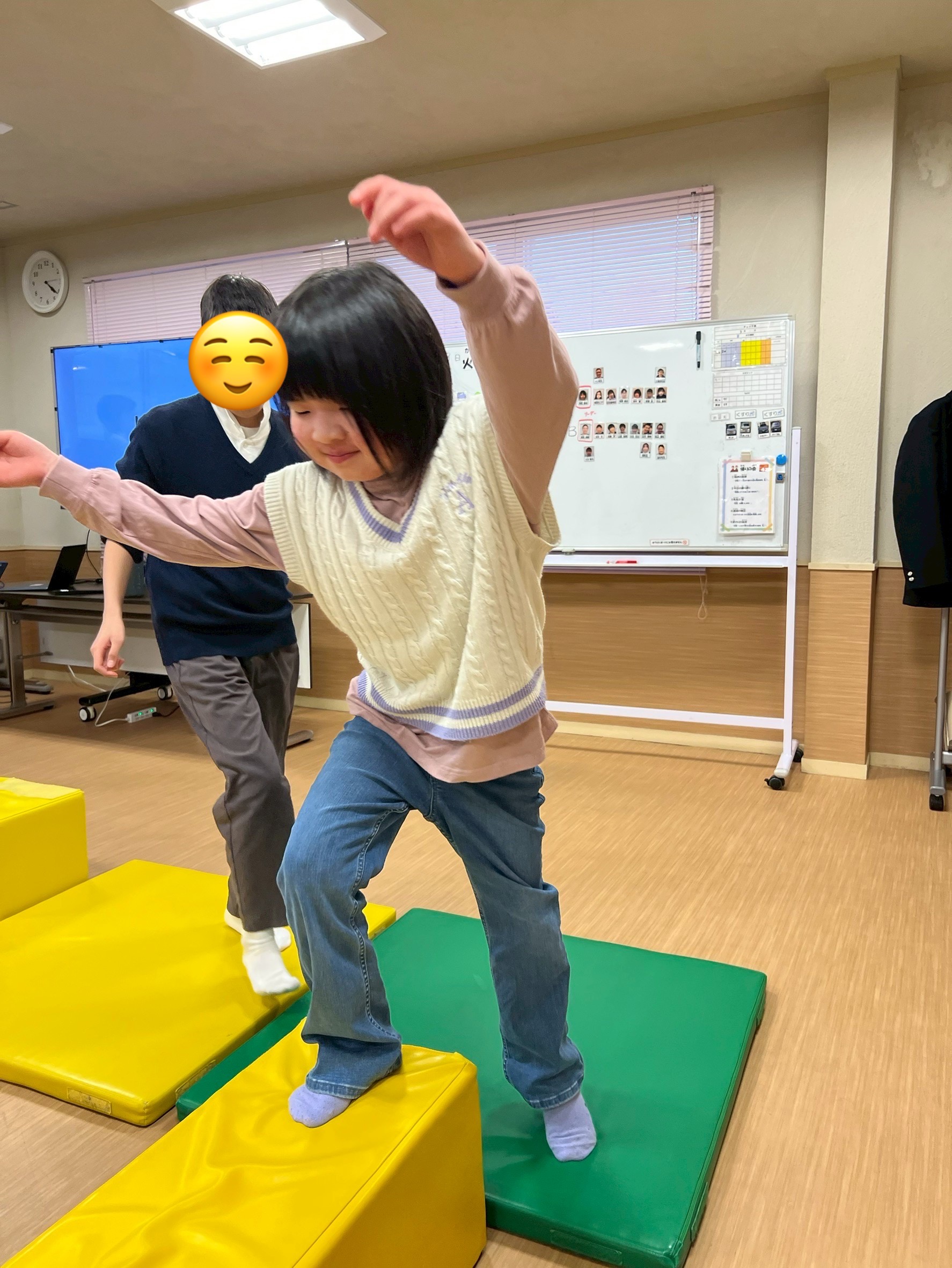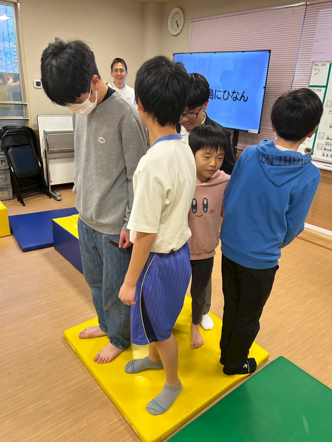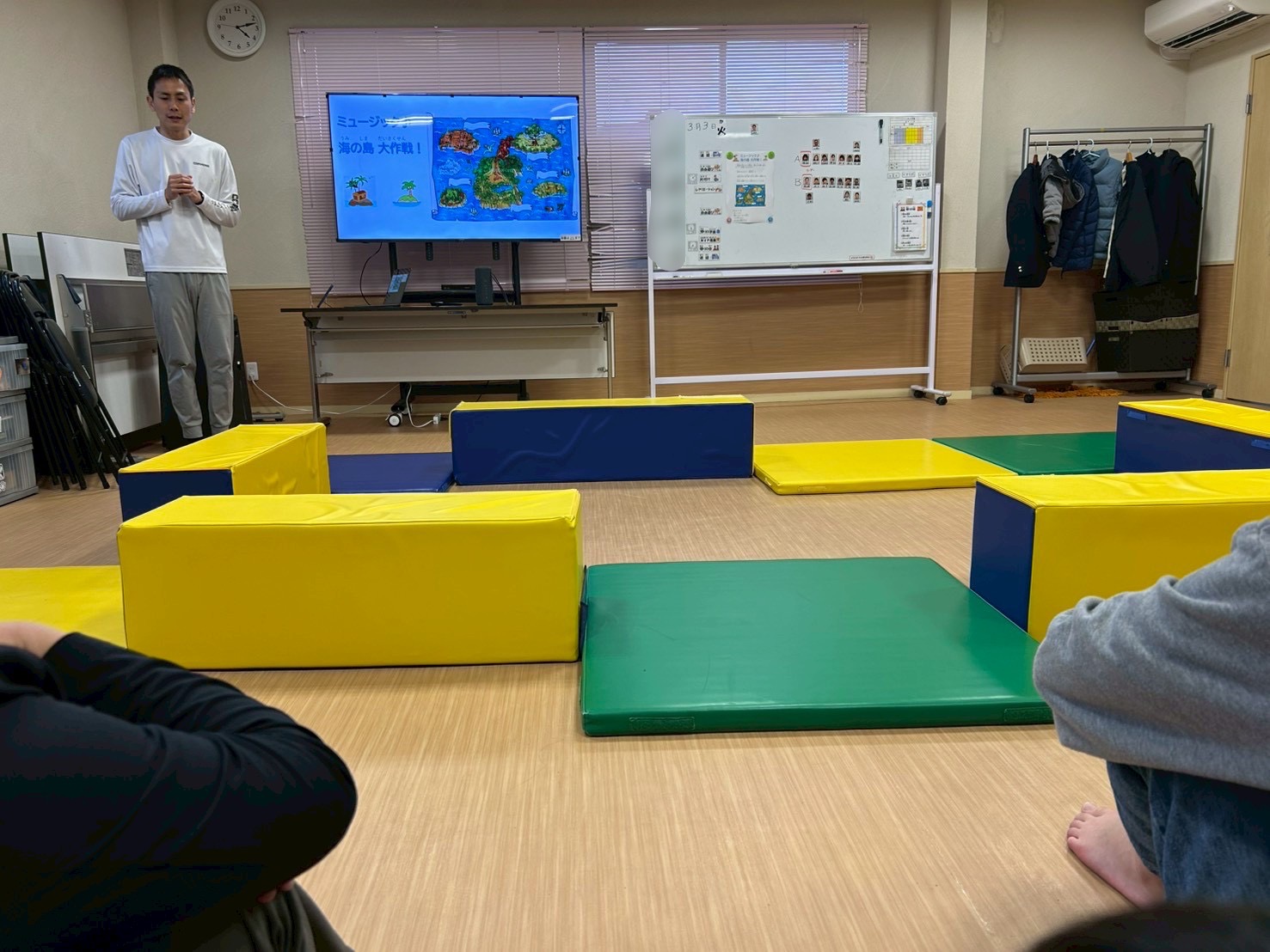 今回は、横に広いカラーマットを「島🏝️」、細長いマットを「橋🌉」に見立て、島を探検する設定でスタートしました。音楽が流れている間は、島の周りをぐるぐる探検気分で移動します🎶😊 そして音楽が止まると…嵐発生!🌪️ その瞬間に出された指示通りに動き、安全な島へ避難するゲームです。