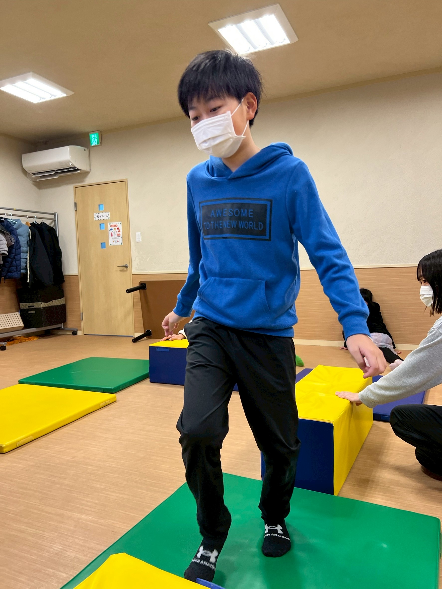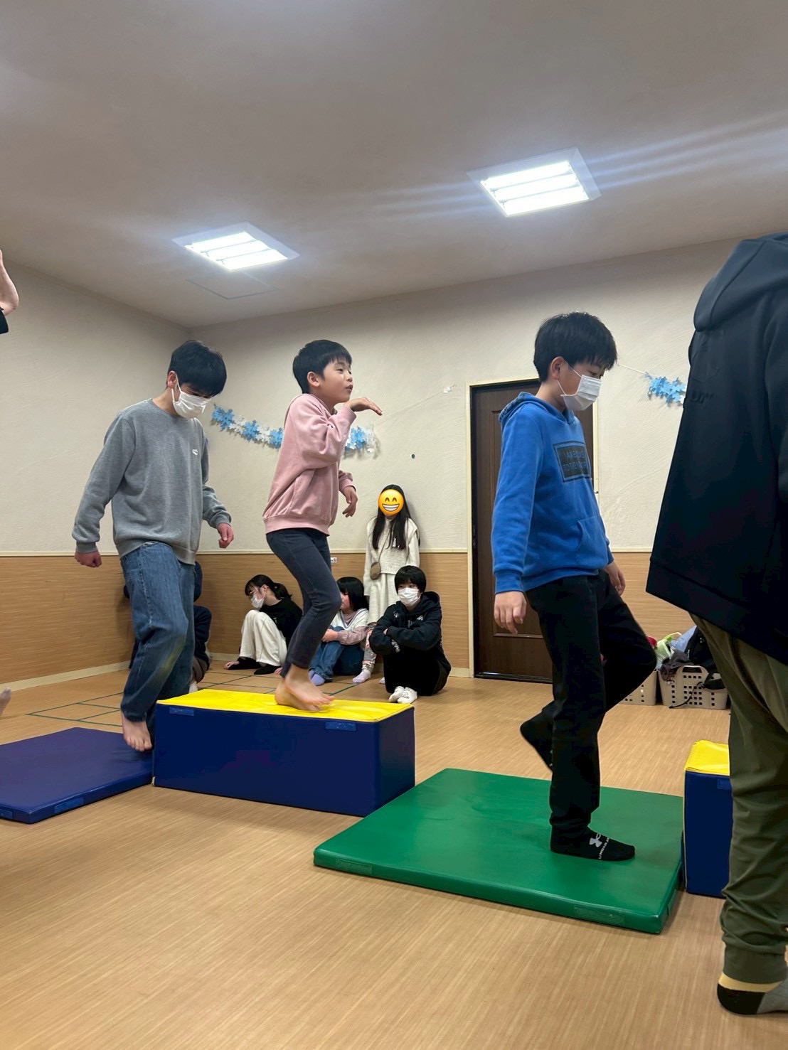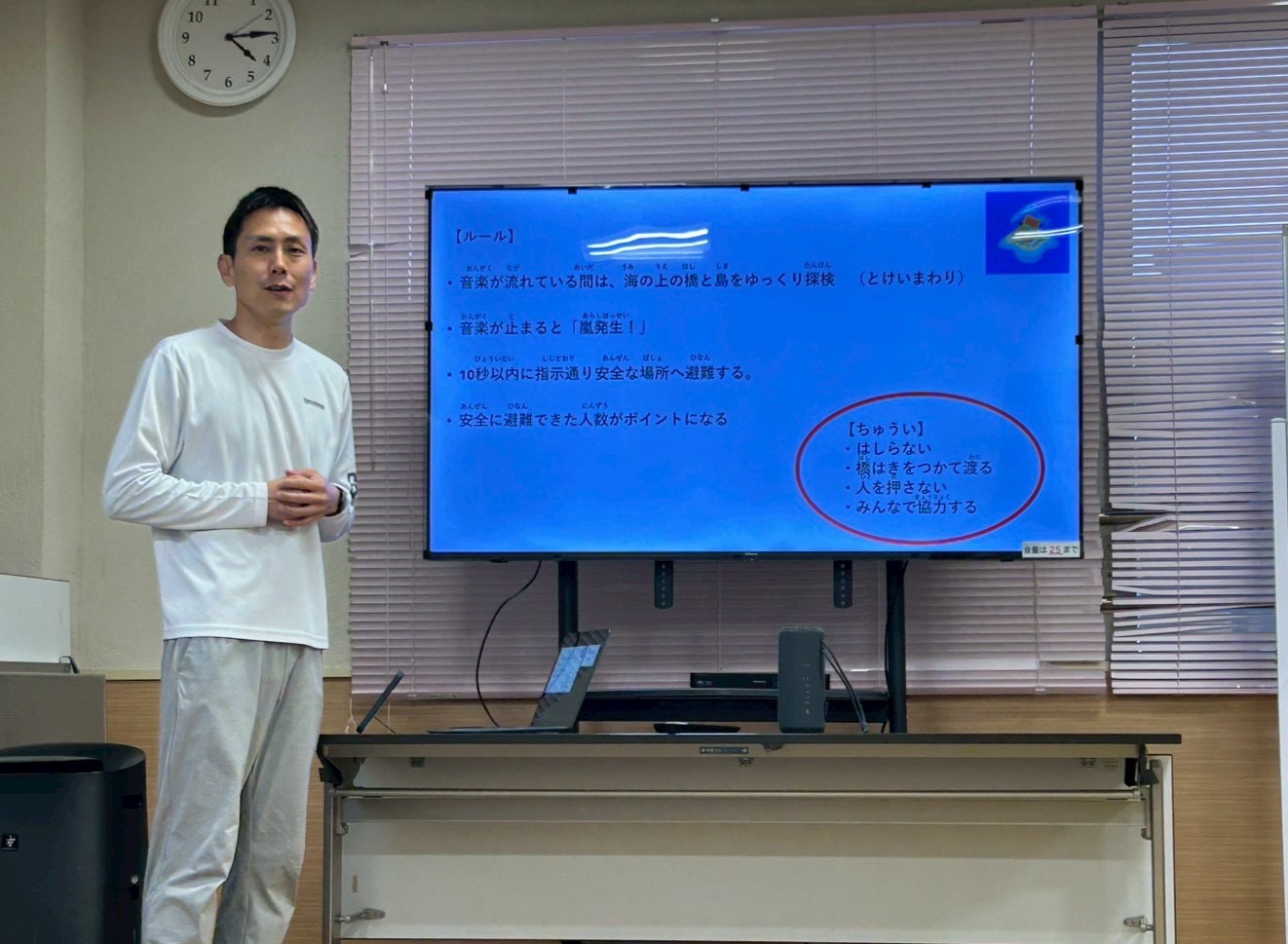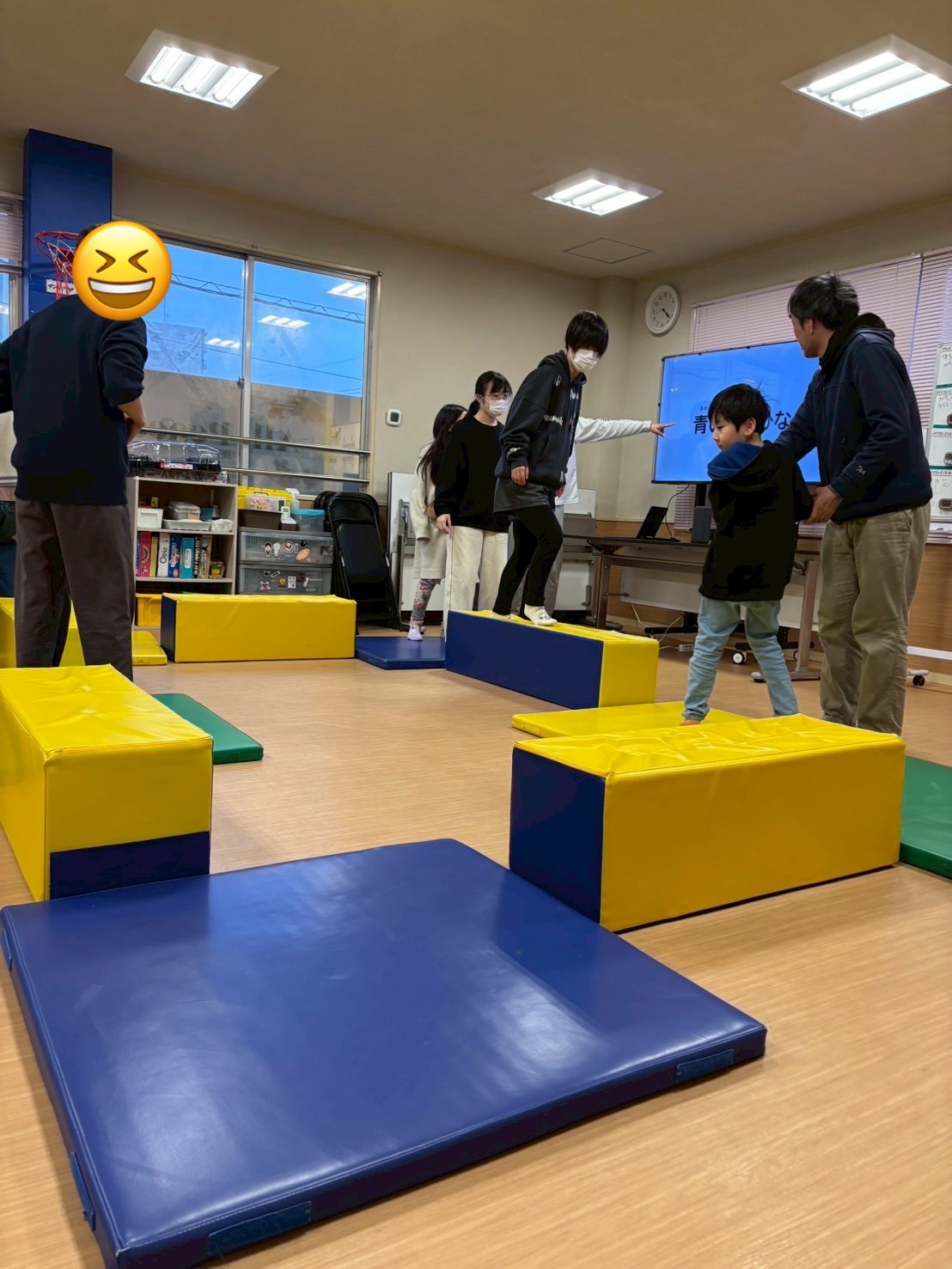 今回は、横に広いカラーマットを「島🏝️」、細長いマットを「橋🌉」に見立て、島を探検する設定でスタートしました。音楽が流れている間は、島の周りをぐるぐる探検気分で移動します🎶😊 そして音楽が止まると…嵐発生!🌪️ その瞬間に出された指示通りに動き、安全な島へ避難するゲームです。