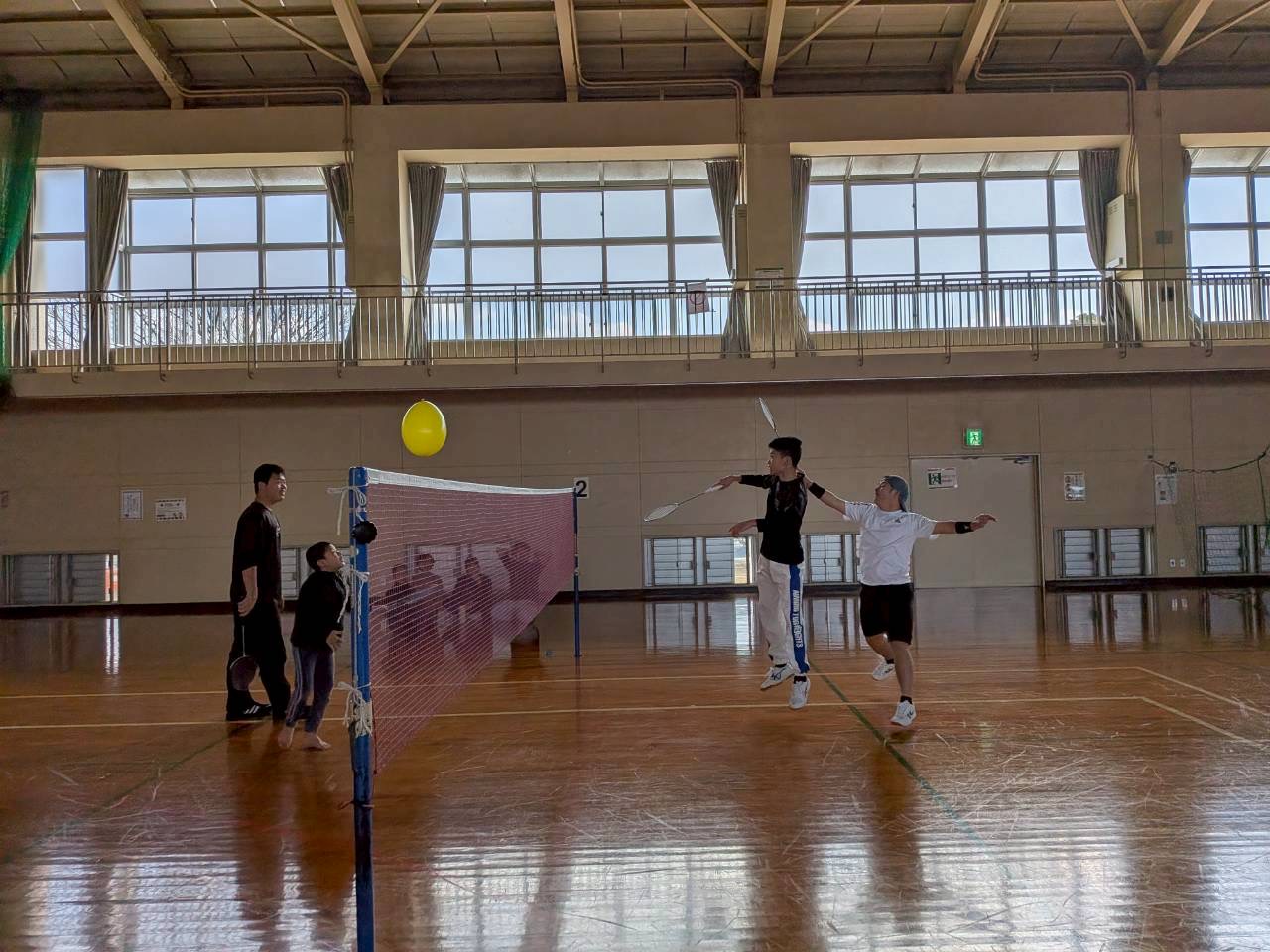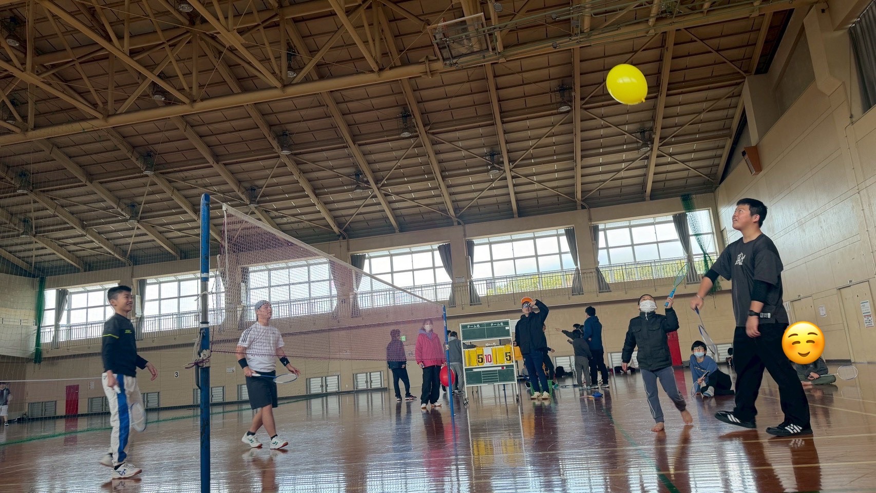 風船とシャトルを交互に使いながら、ダブルスで5点マッチのルールで行いました😁