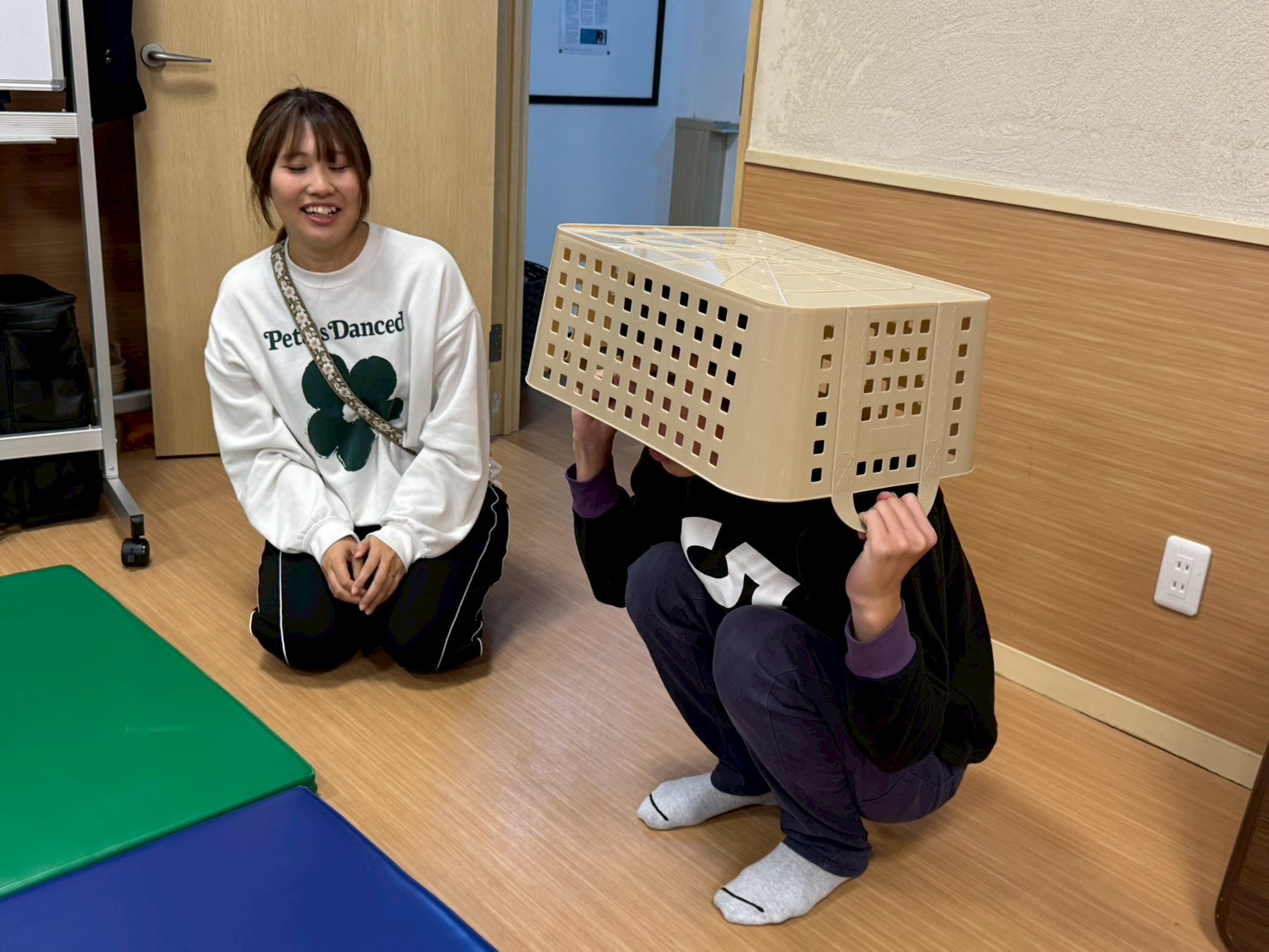 ん🤔籠被る…しゃがみ込むまでは良いのですが………😅あっ!お尻ついてない😰お尻つけないと…揺れが大きいと…身体も揺れて…倒れて怪我することになります!こちらも、すぐにスタッフが声をして…お尻をついてしっかり座りおさまるまで待つ事が出来ました🙋高校生だからしっかり出来てるかなと思いましたが……惜しかった😅