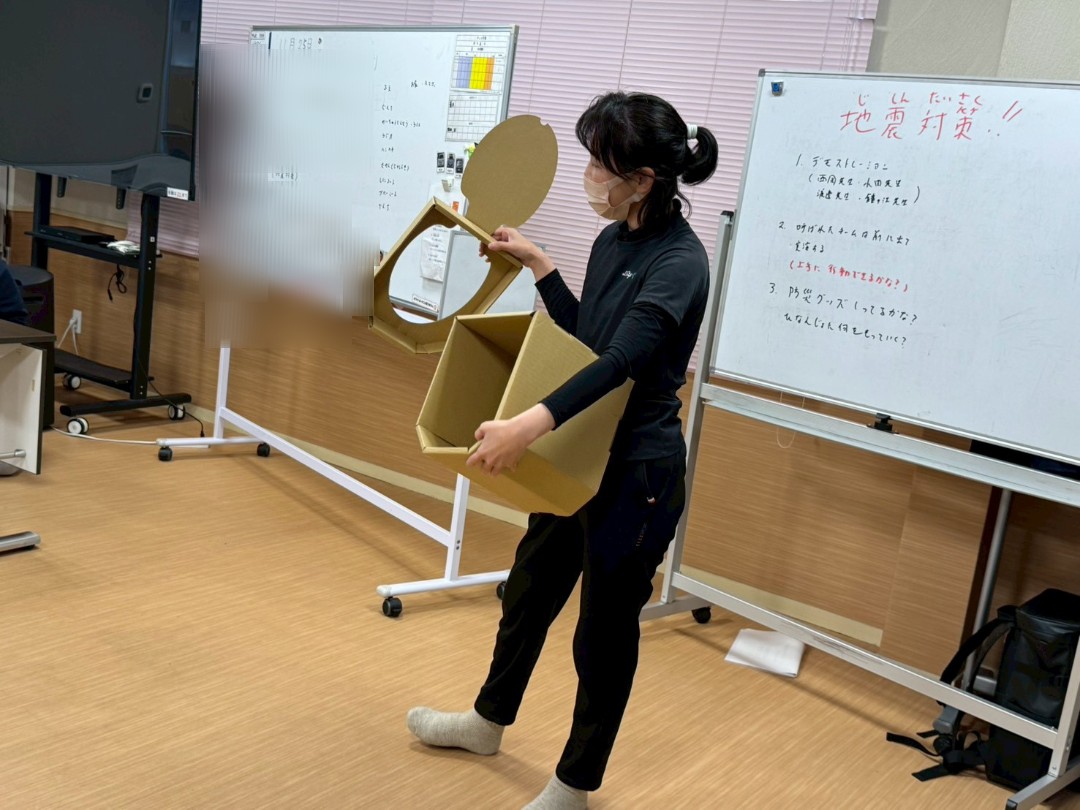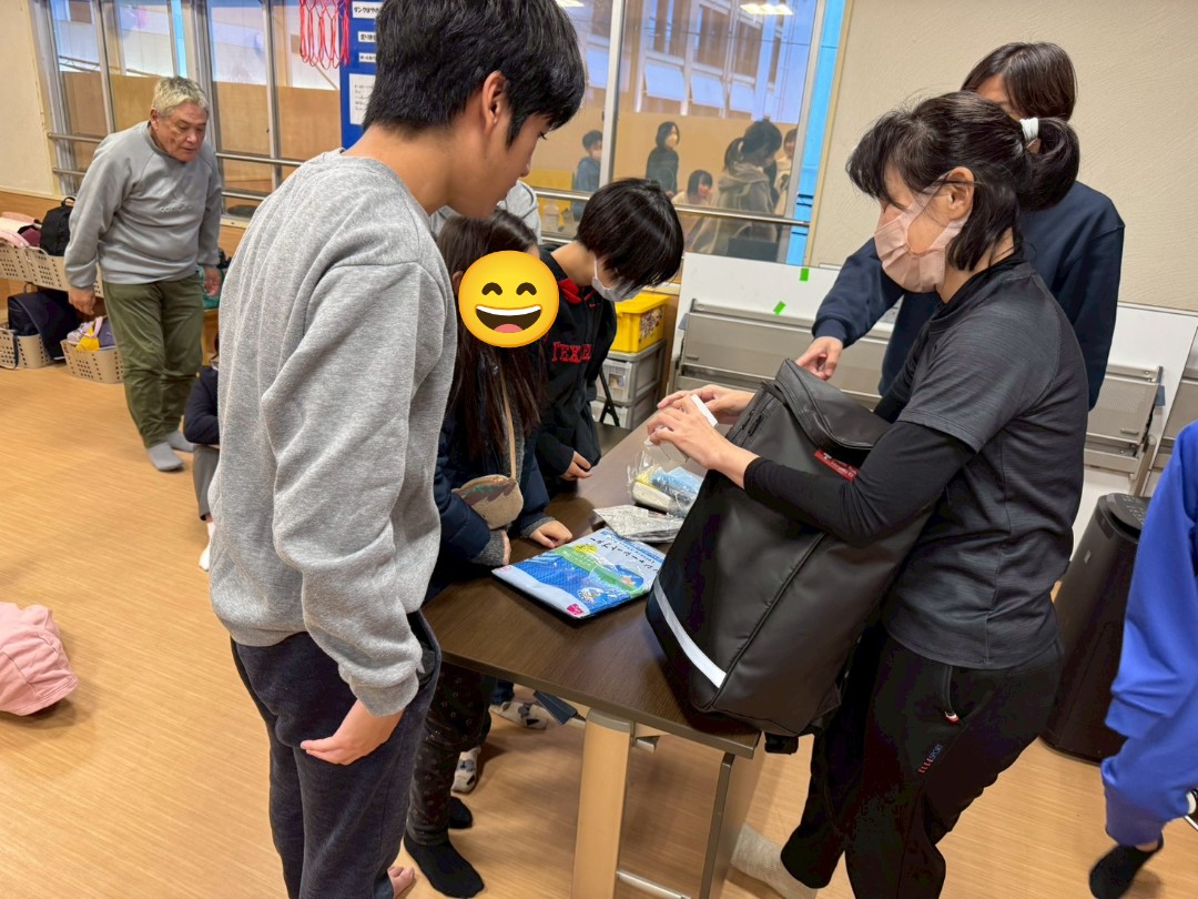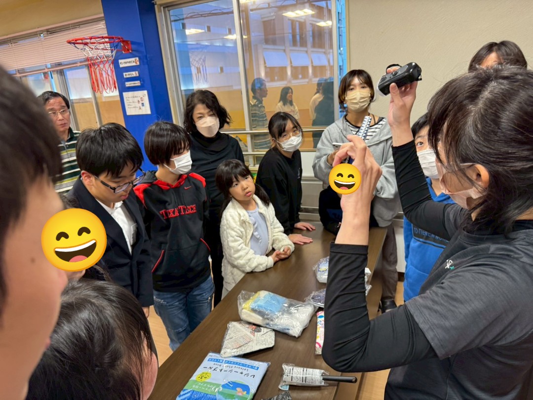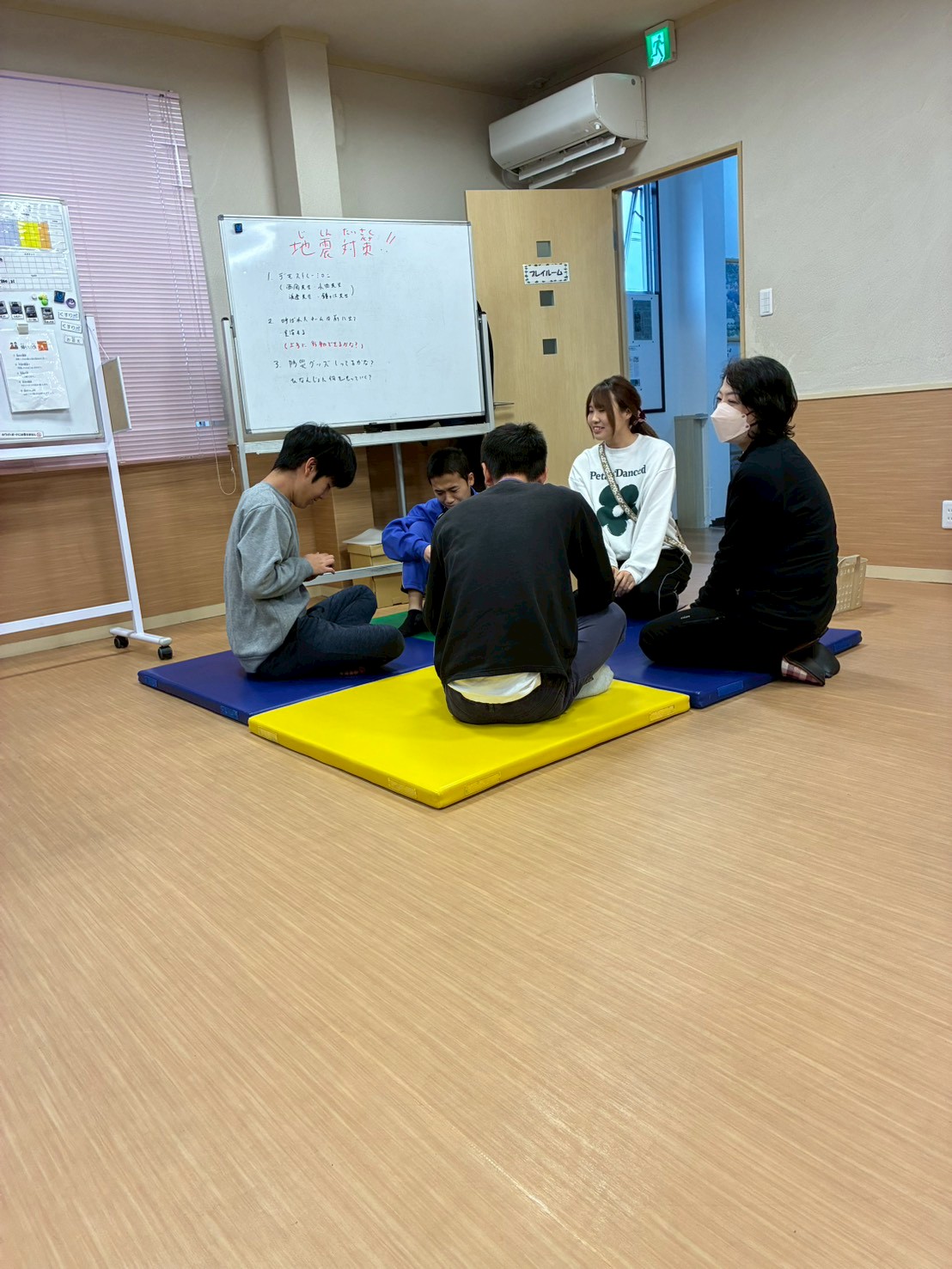 今回は、4グループに分かれて、それぞれ1チ−ムずつ前に出て地震🫨が起きたときに、どのように行動をとるのかを実演。その後、防災グッズ🔋🔦🧤⛑️が何があるのか…避難所には何を持って行けば良いのかを確認しました😊