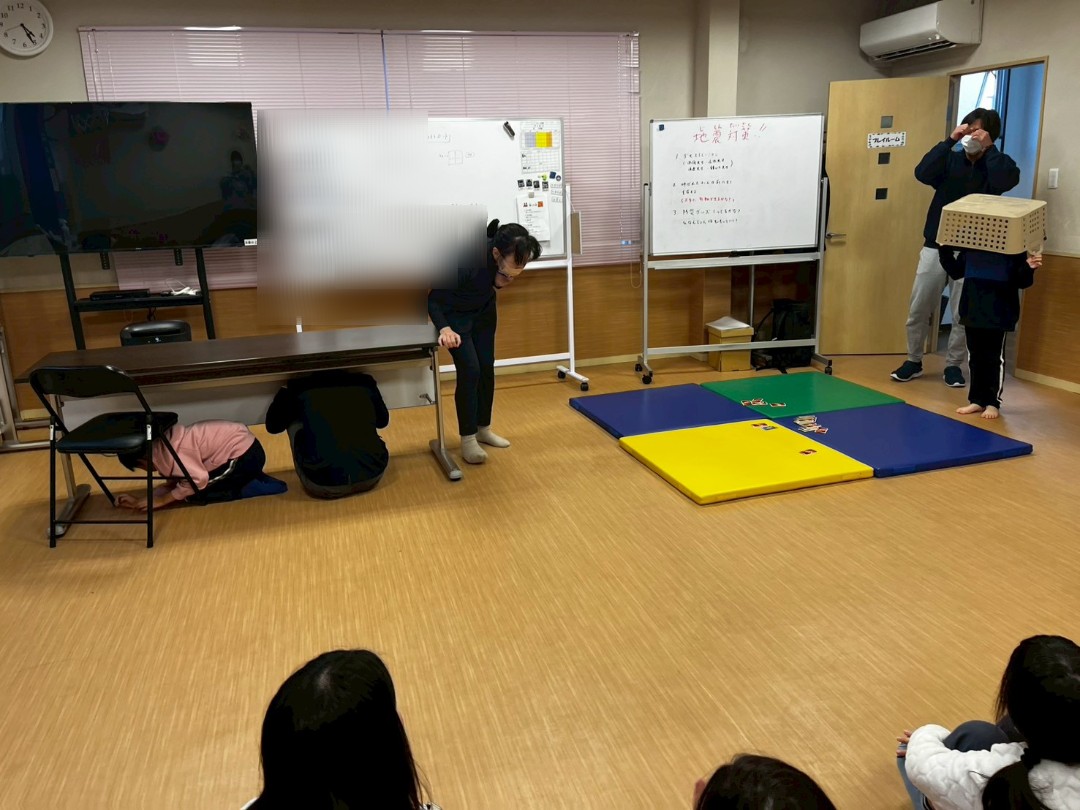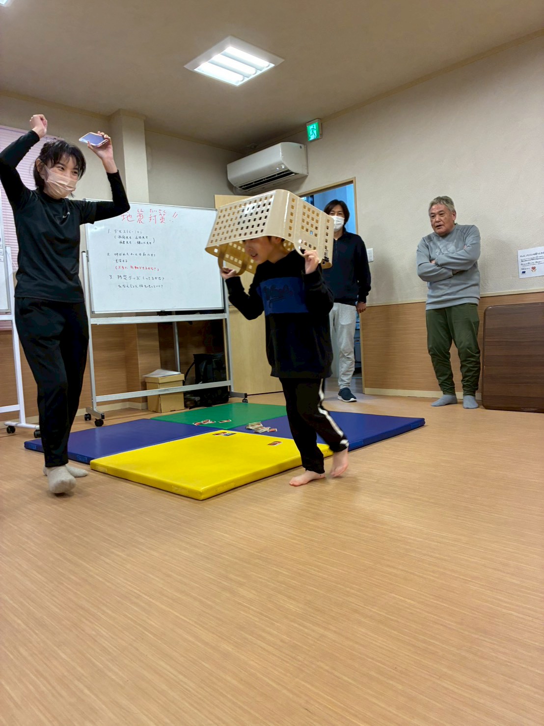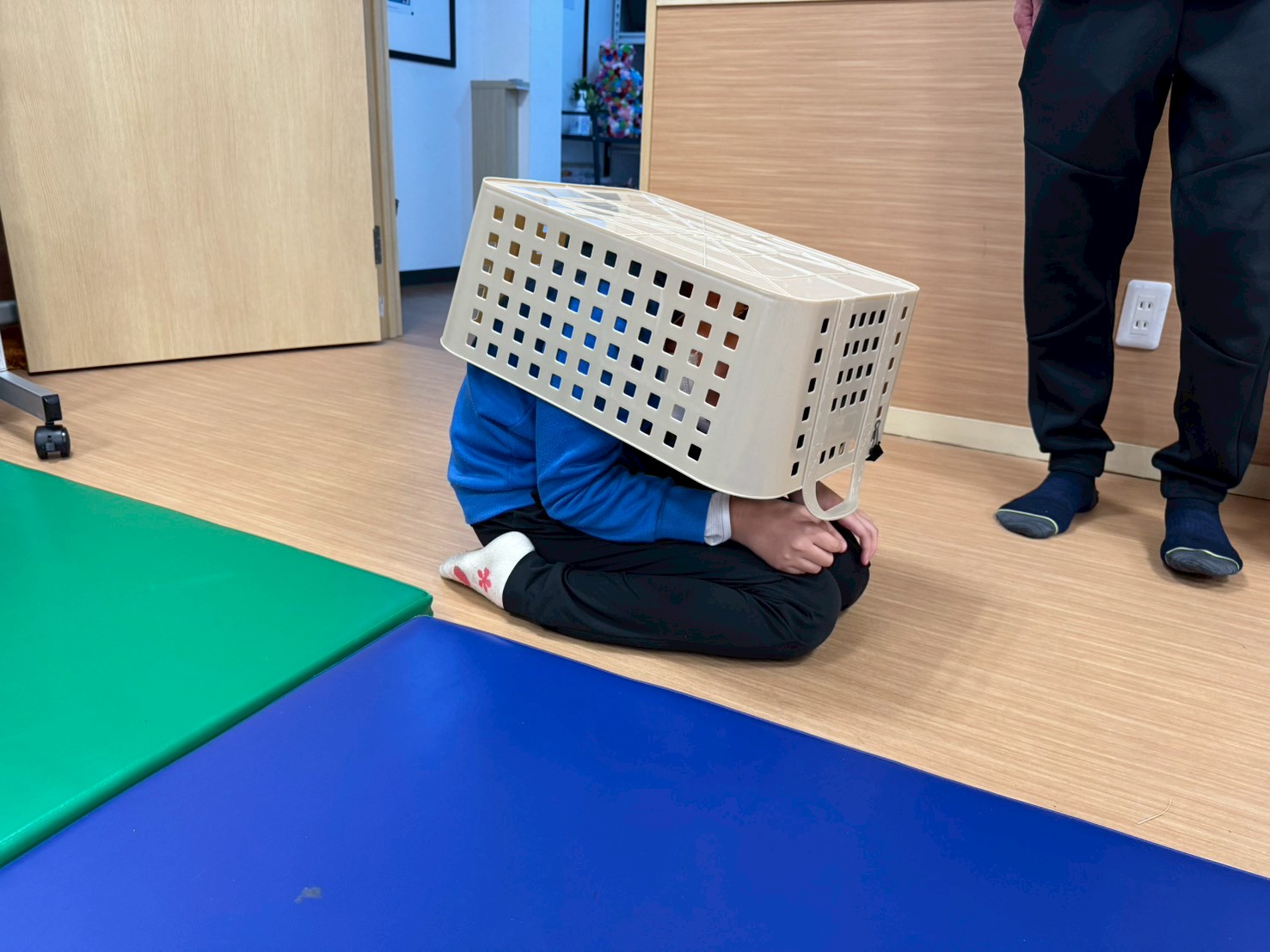 マットを頭に乗せるはどう?挙手する子ども数人…次に籠を頭に被せるこれは?と聞くと大丈夫と挙手🙋どちらも良いと思うのですが…マットは▲ですね…😅何故なら……上からホワイトボ−ドが倒れたり、電球が堕ちて来ると大きいのでズレて滑り落ちて…頭に辺り大怪我をしてしまうからです😰頭を覆う事は良い事ですが、不安定な物は危ない!と伝えました🙋これらをふまえて、いよいよ、子ども達の実演開始🙋