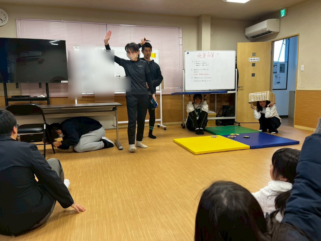 スタッフがデモストレーションを行ない、スタッフが取った行動を、子ども達に合ってるかを確認し、合ってたら挙手🙋してもらいました。