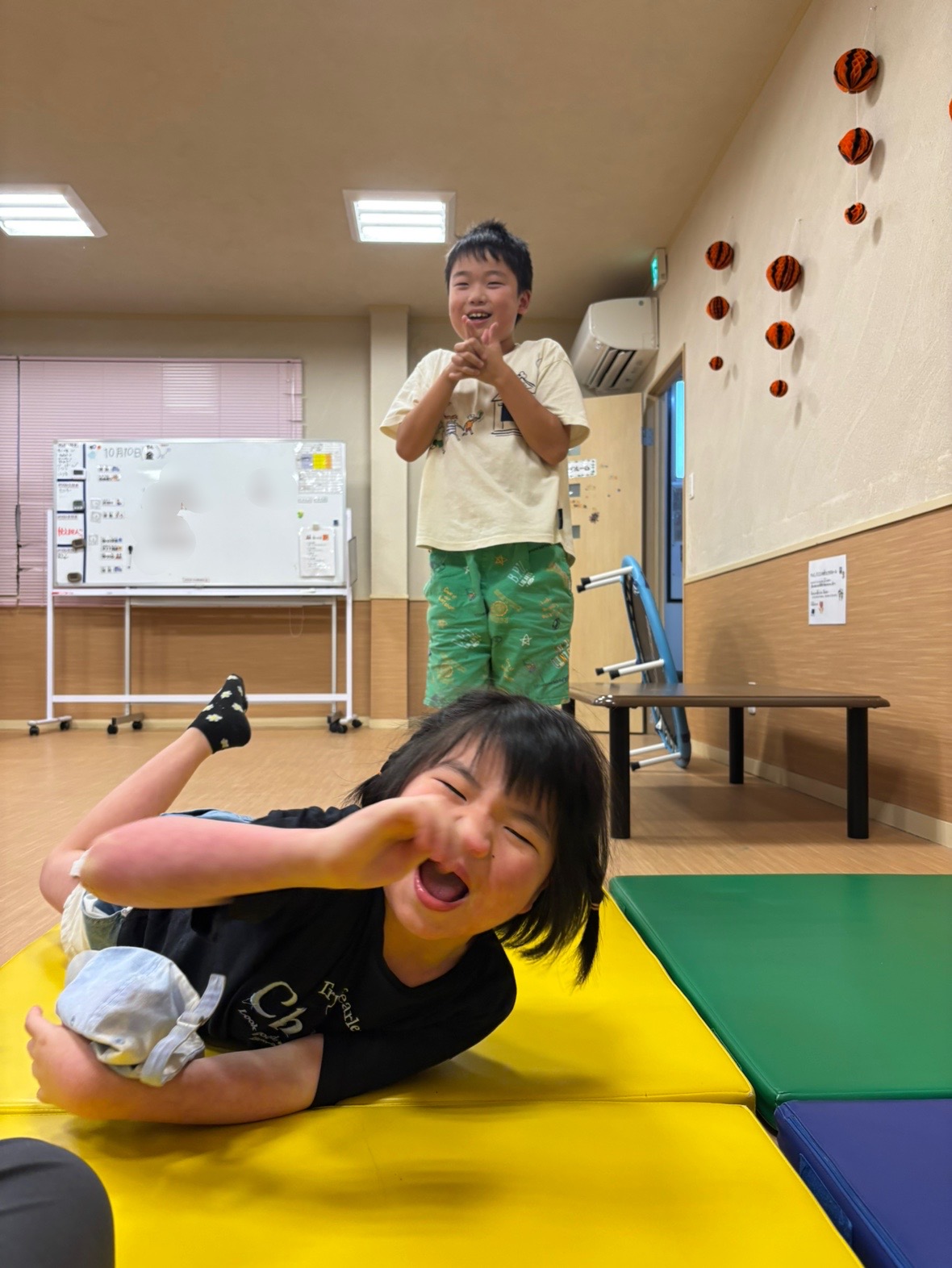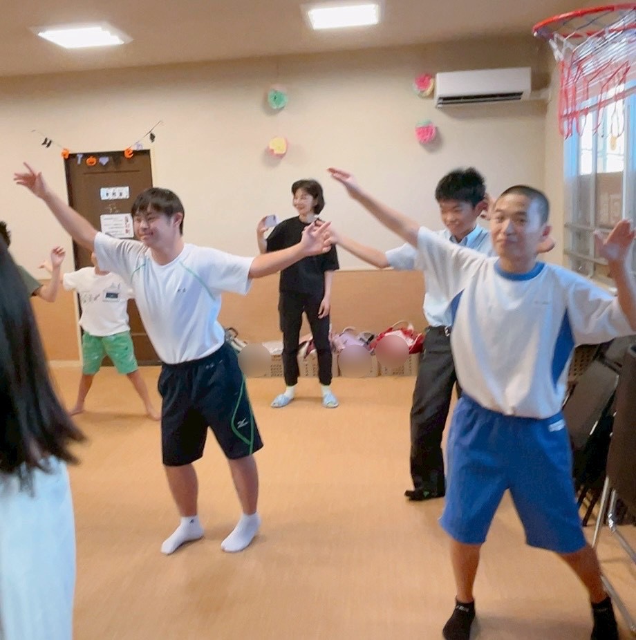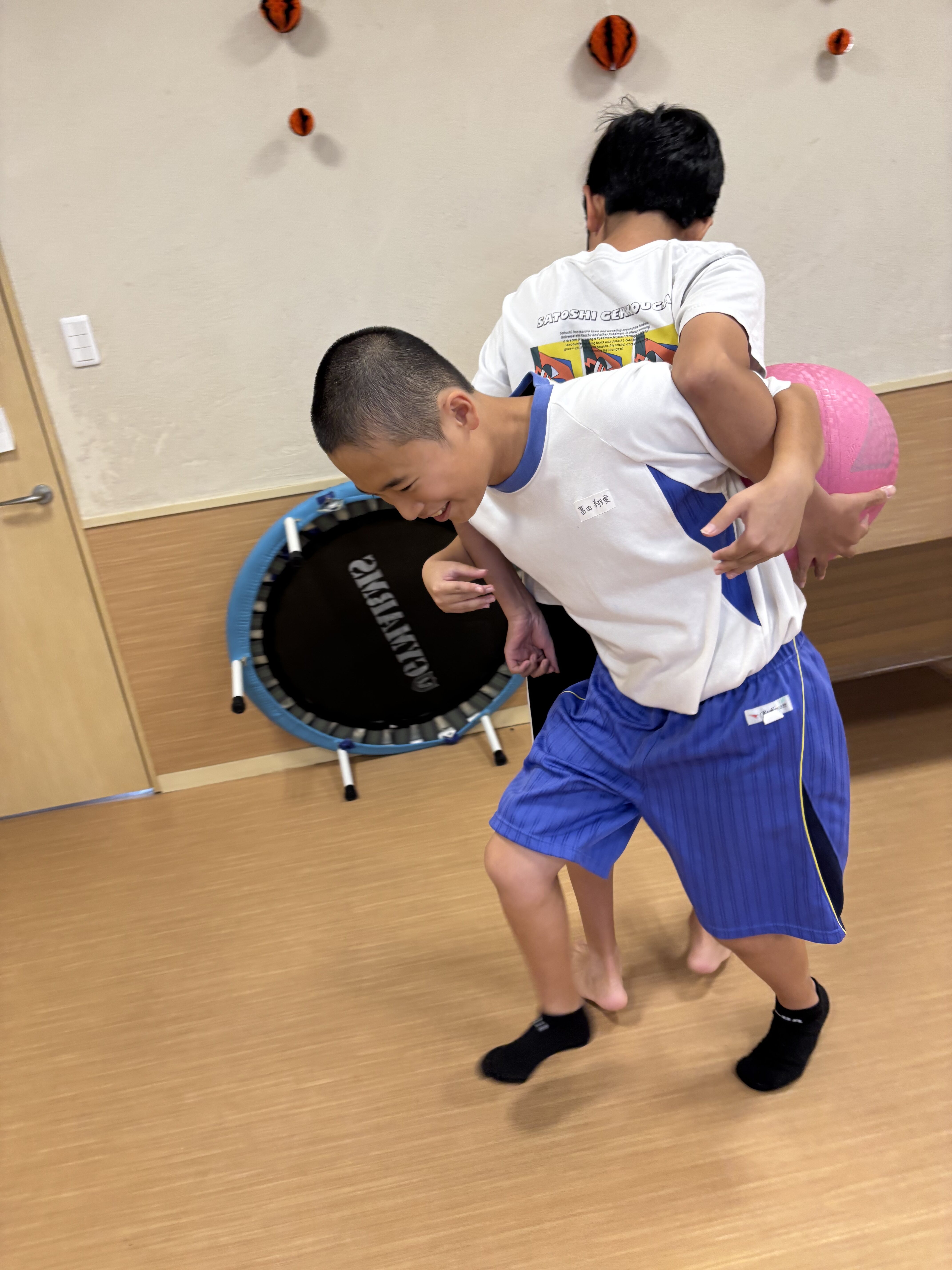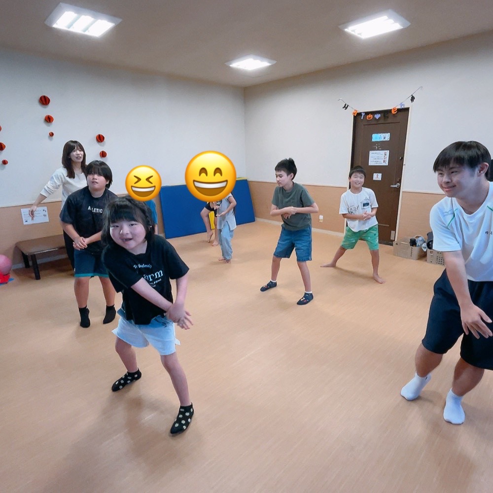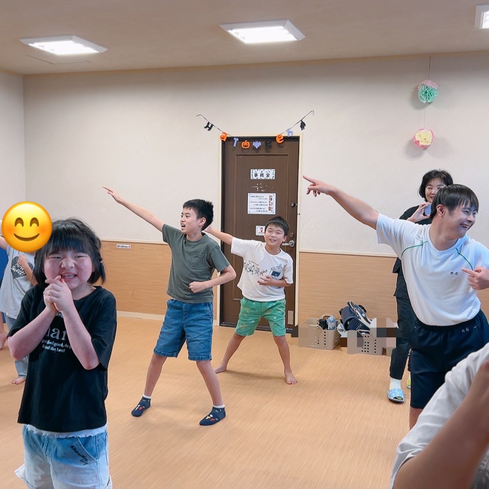 色んな忍者ポーズ🥷をとって、それを真似してもらってキープすることで、体幹筋力やバランスの向上、ボディイメージと体をイメージ通りに使うことの練習を目的としましたが、みんなが楽しそうだったので、準備していた忍者ポーズではなく、今回はナルトダンスの中の踊りをそのまま使いました🕺