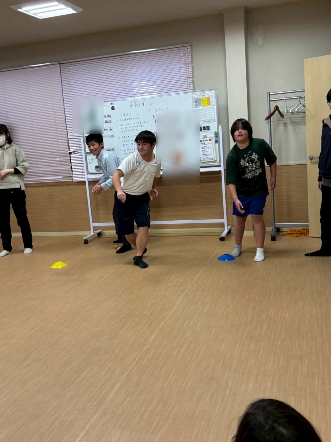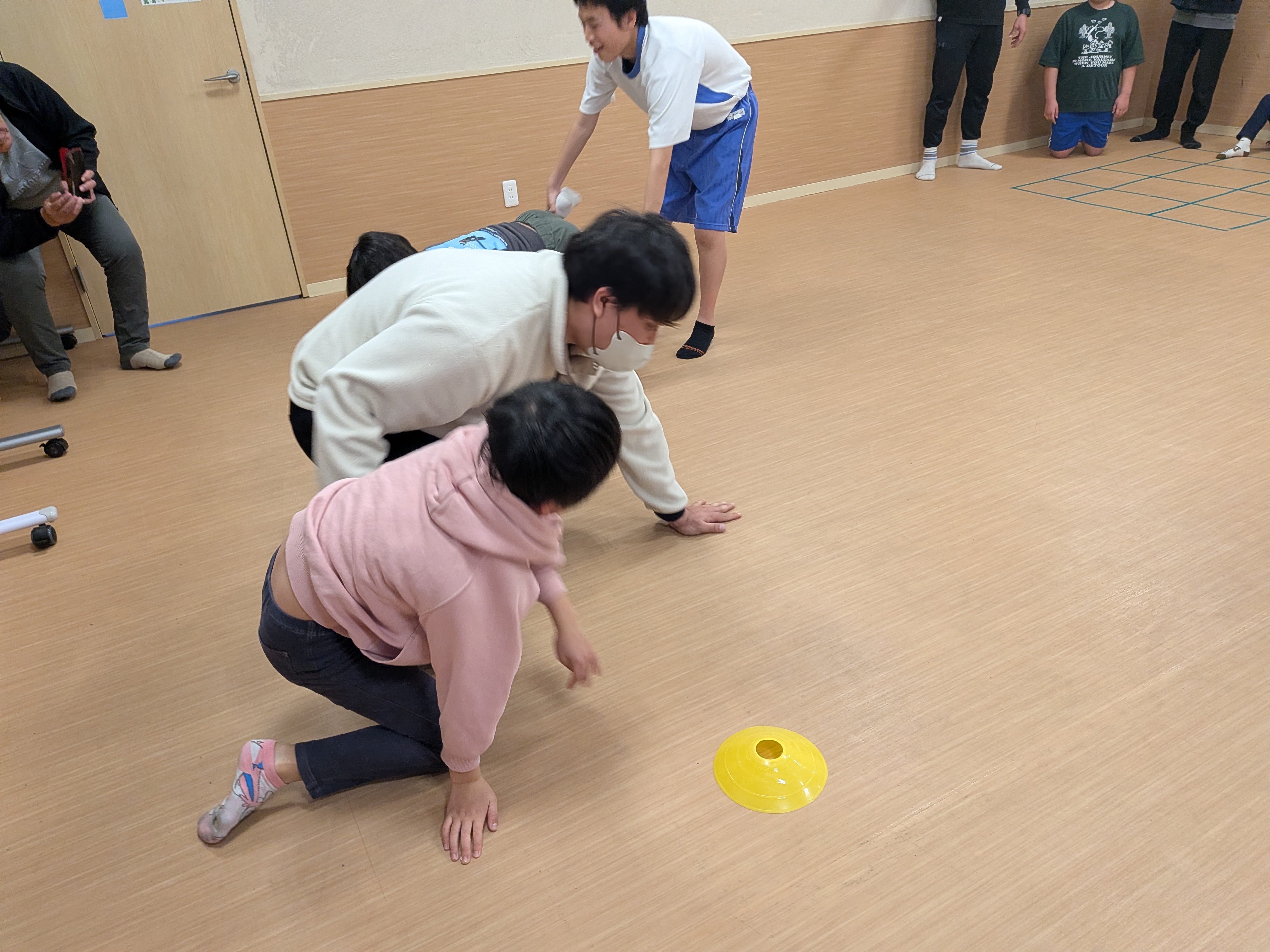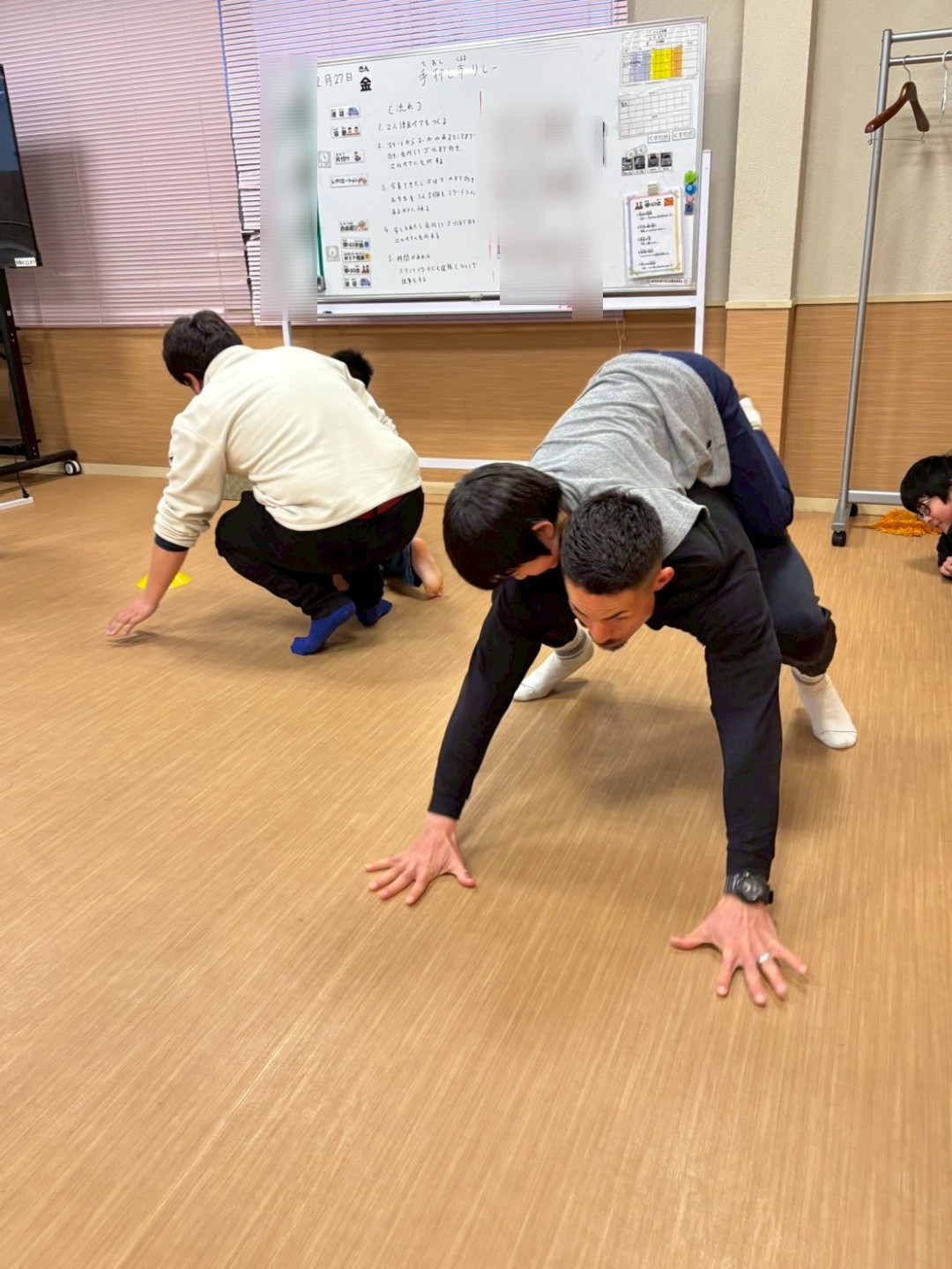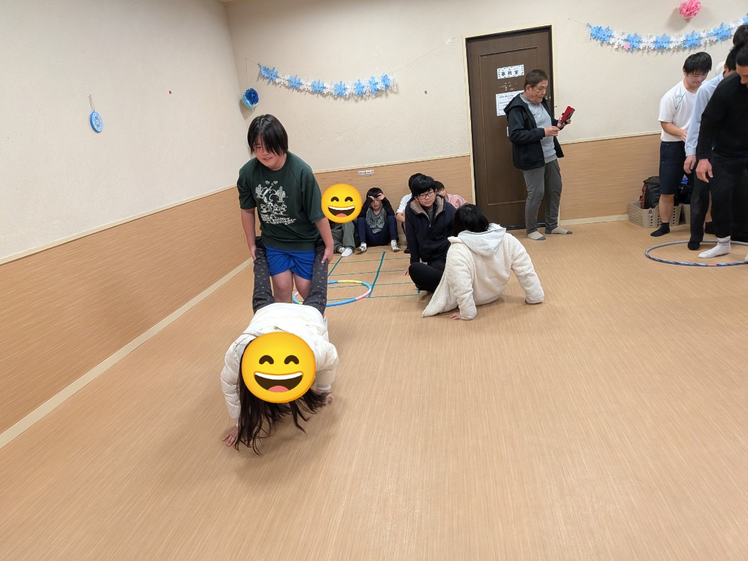 本日はレクリエーションで「手押し車リレー😁」を実施しました🙋普段のレクリエーションでは、工作やミュ−ジックカルタ🎵等ですが、今回は、身体動かして……相手に合わせて行動が出来るようになる為に実施しました😊