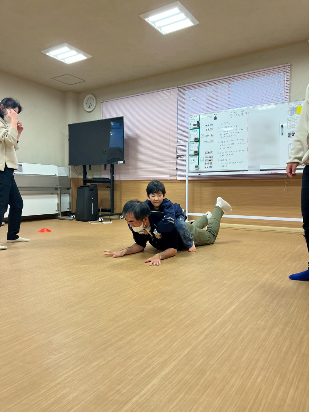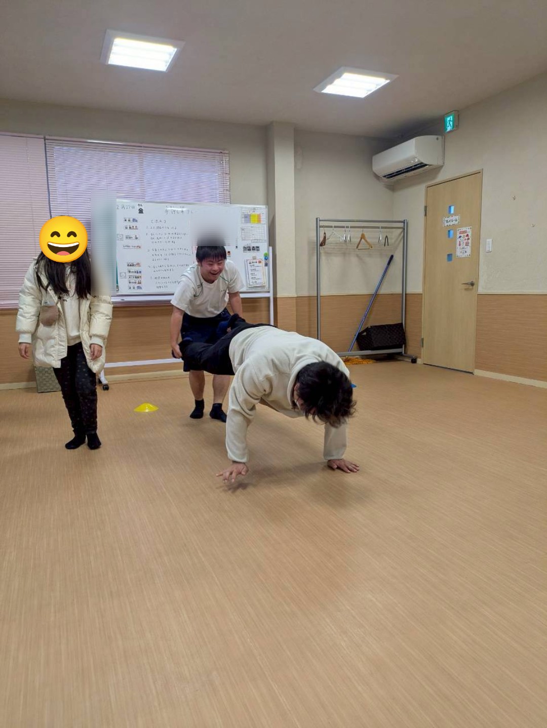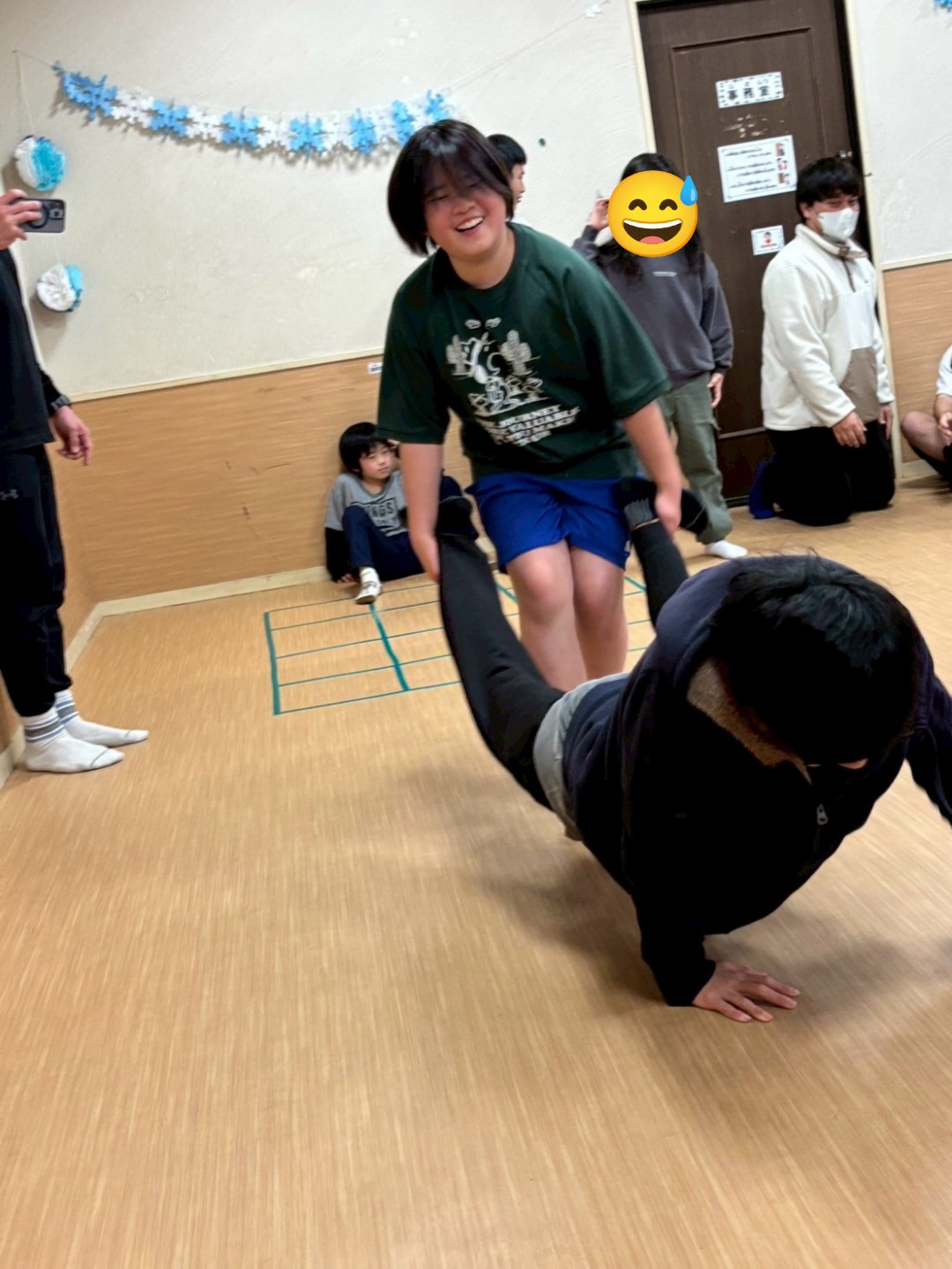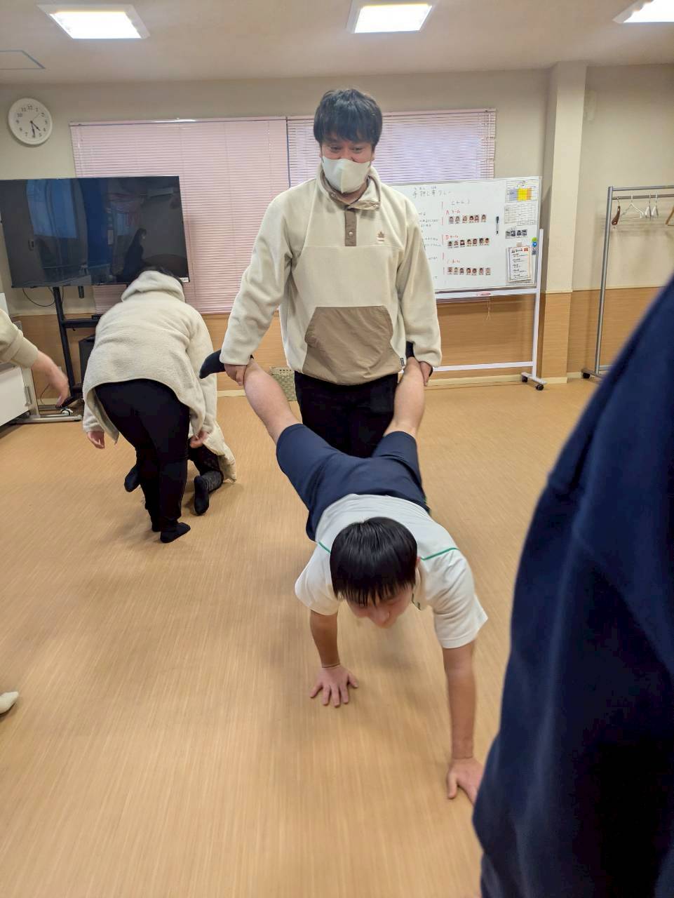 本日はレクリエーションで「手押し車リレー😁」を実施しました🙋普段のレクリエーションでは、工作やミュ−ジックカルタ🎵等ですが、今回は、身体動かして……相手に合わせて行動が出来るようになる為に実施しました😊