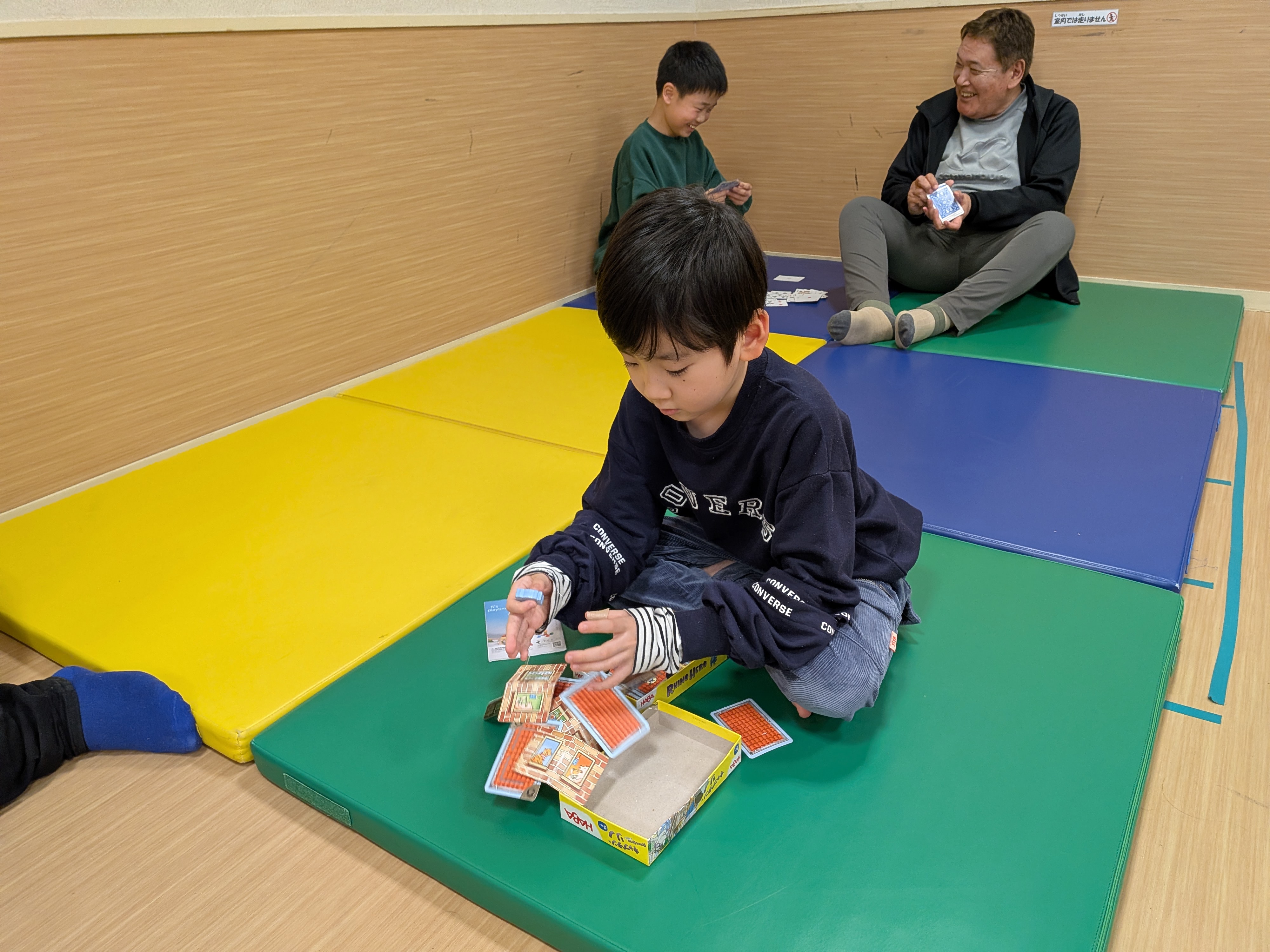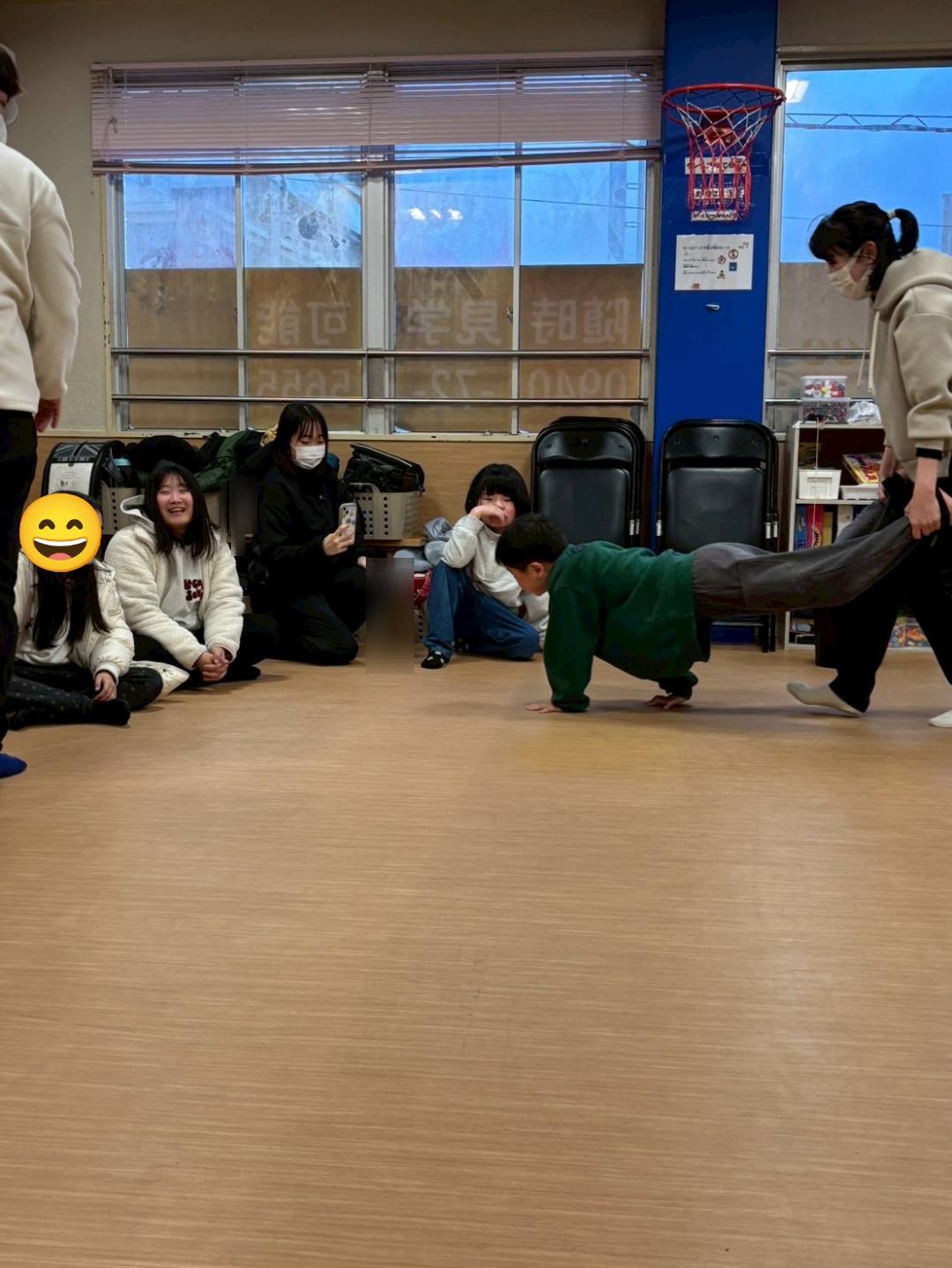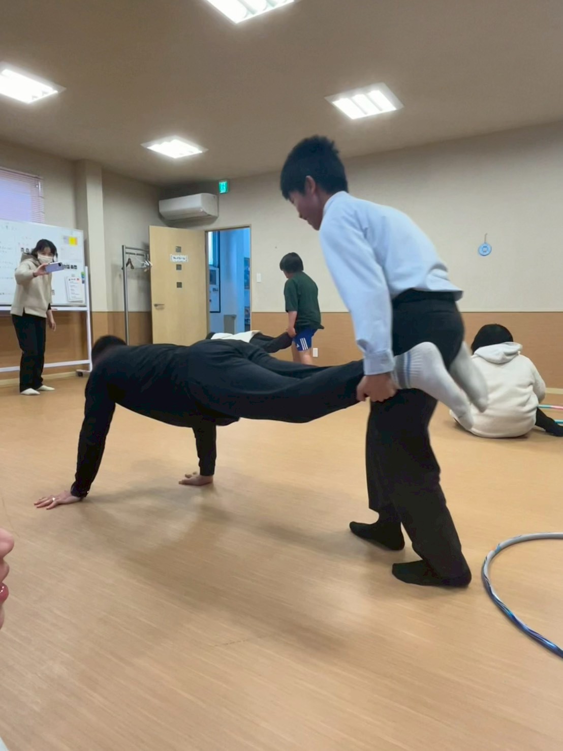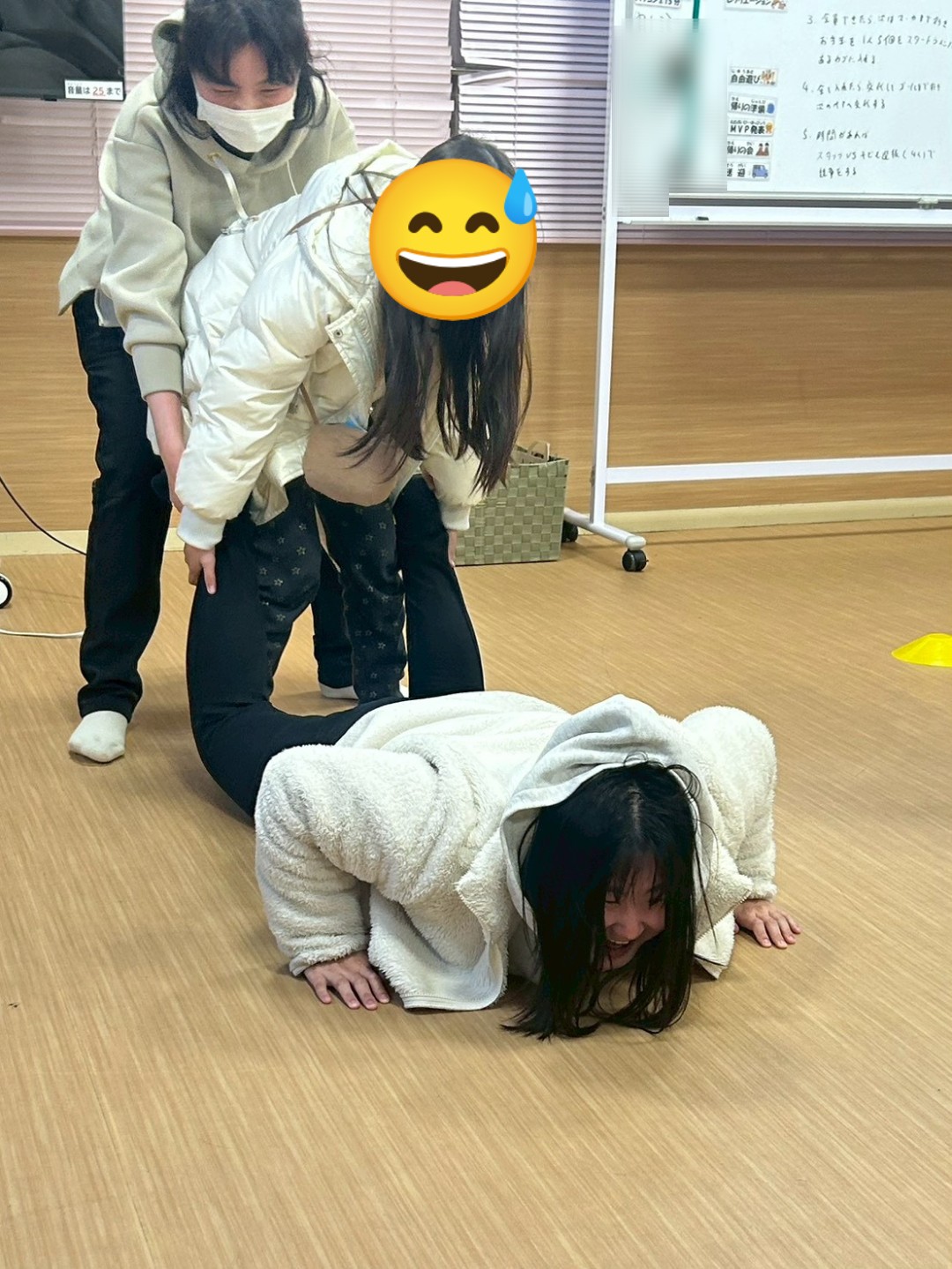 本日はレクリエーションで「手押し車リレー😁」を実施しました🙋普段のレクリエーションでは、工作やミュ−ジックカルタ🎵等ですが、今回は、身体動かして……相手に合わせて行動が出来るようになる為に実施しました😊