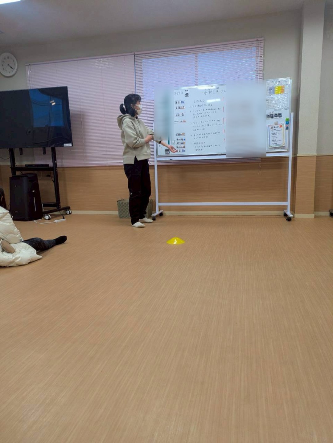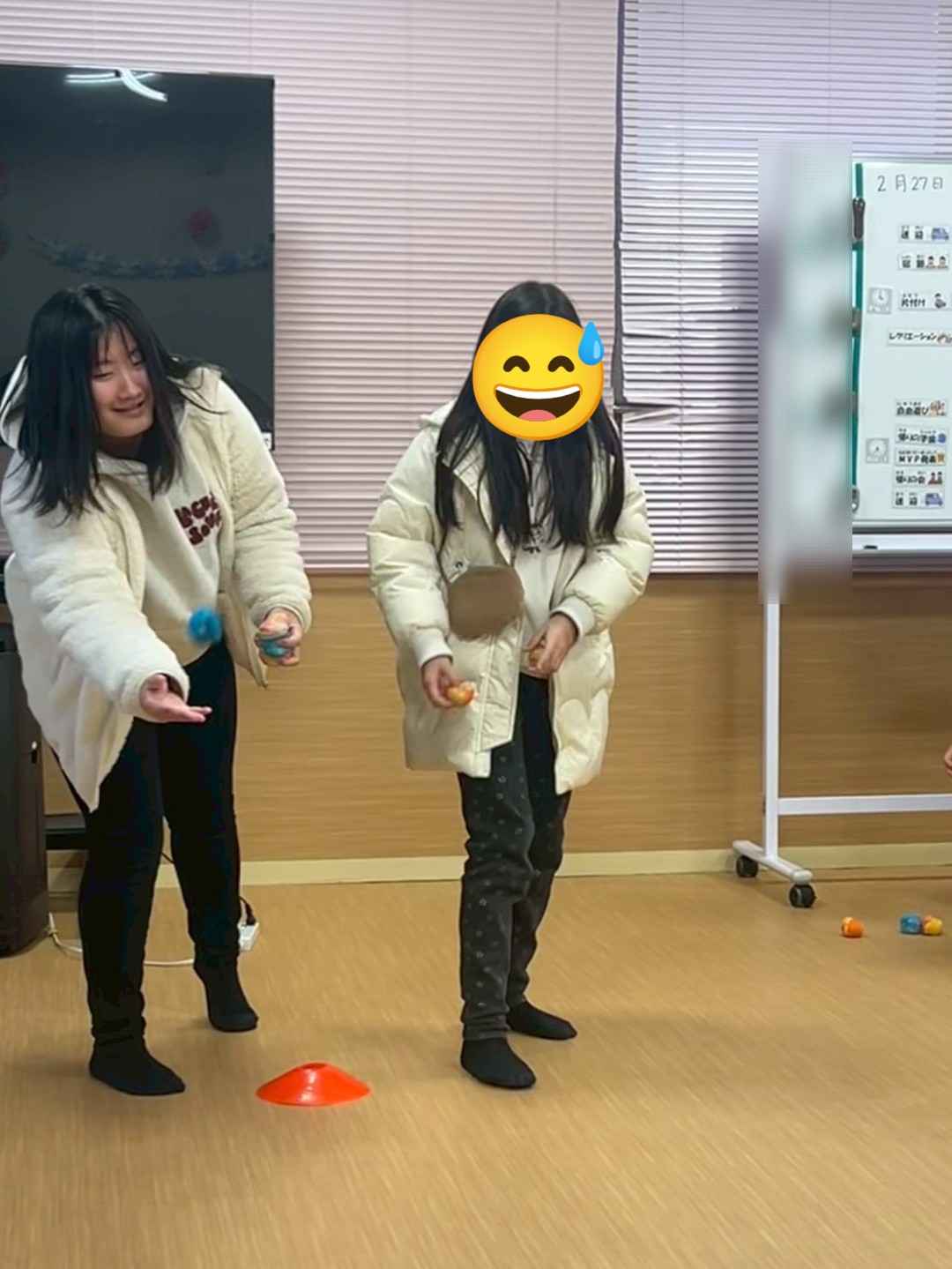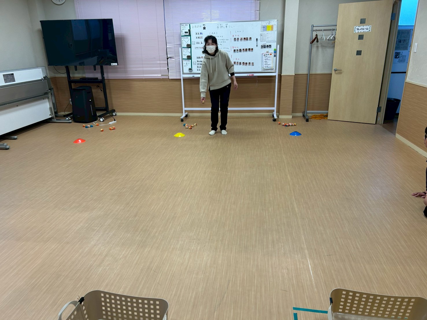 休憩を挟み、2回目を説明。今度は要領は同じで、マ−カ−のところまで行くと、1人5個お手玉をカゴ🧺に入れる。流石スタッフ、1回でカゴ🧺に入りました✨その後、力入れ過ぎると…遠くへ行き入らないよとお手本を見せ…。いざ2回目を実施。