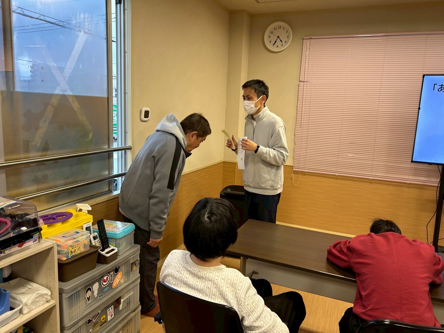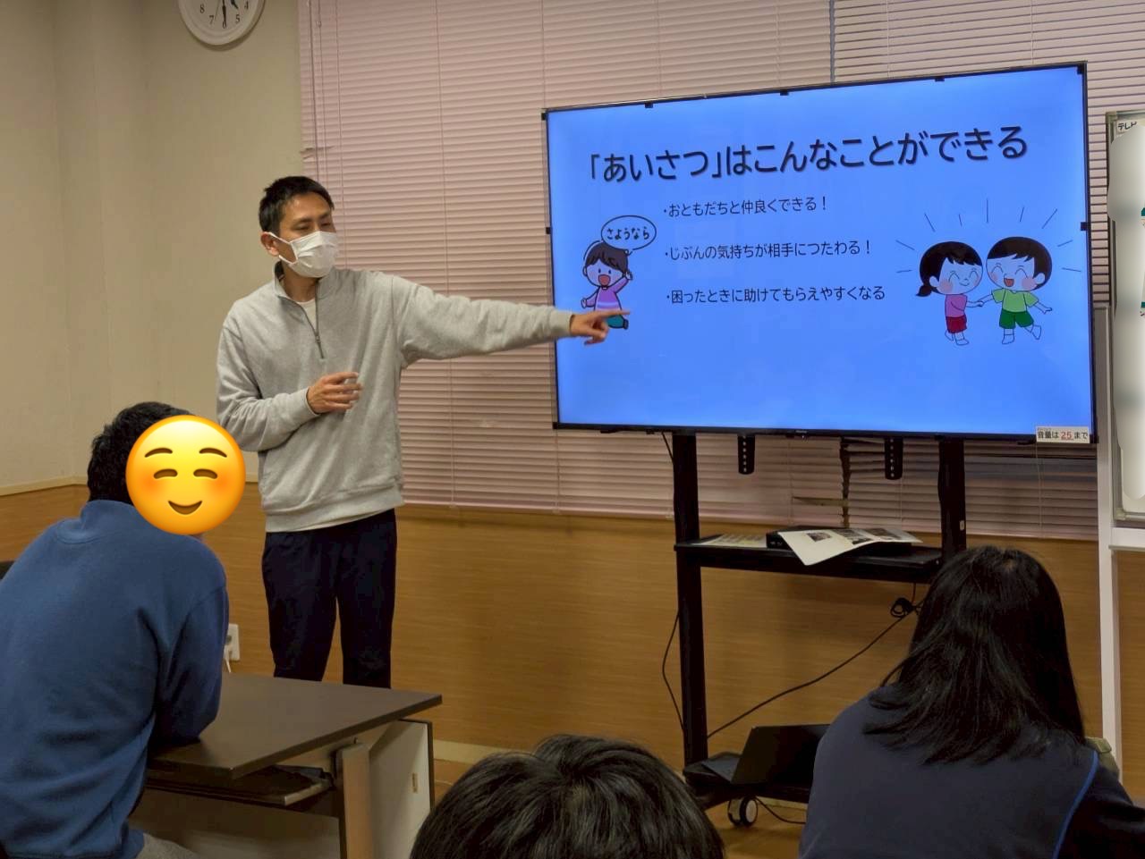 普段は何気なくしている挨拶ですが、「なぜ挨拶が必要なのか?」「しなかったらどうなるのか?」ということを、まずはモニターを使ってみんなで考えました📺