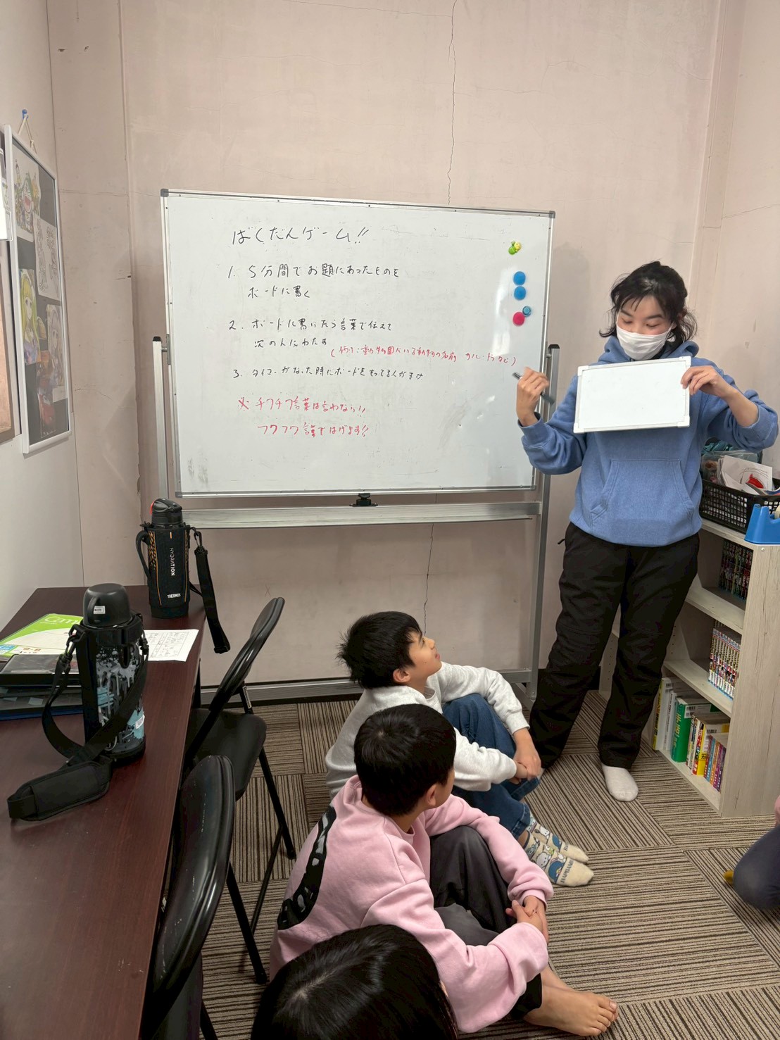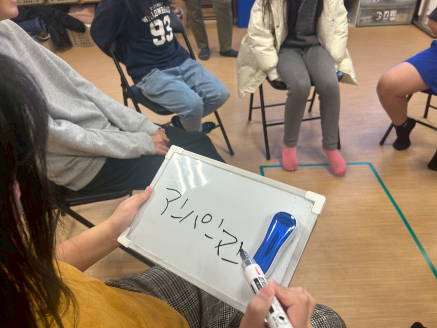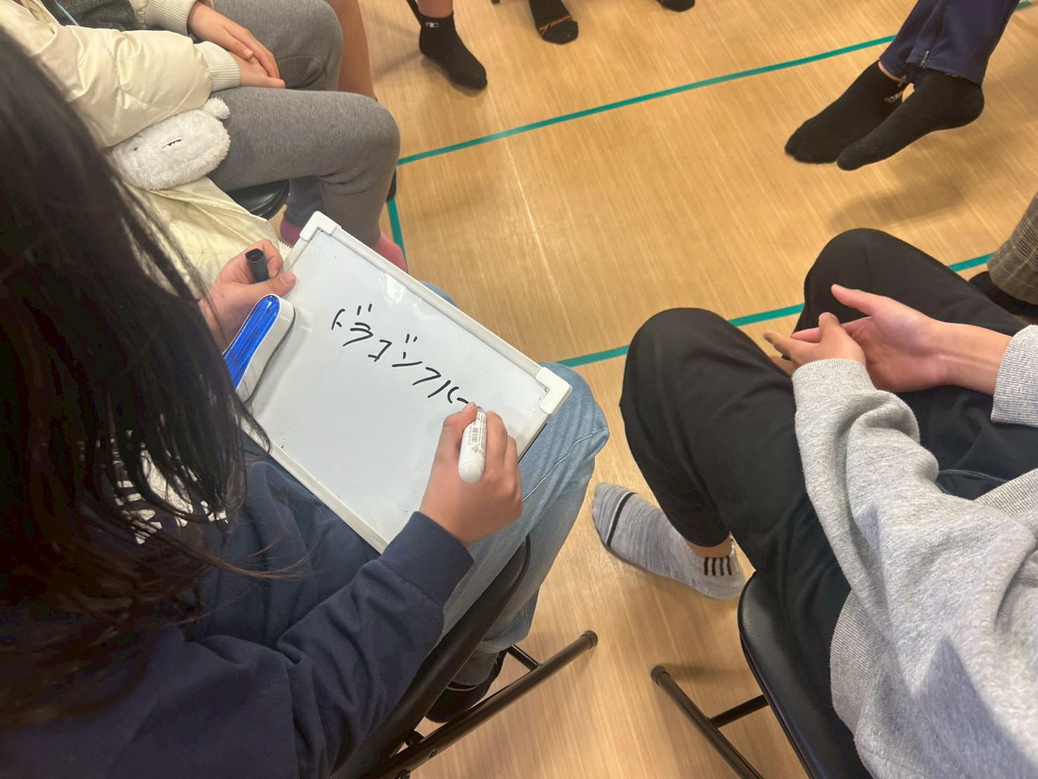前回した時は、ボ−ル⚽を爆弾💣️と見立ててしましたが、今回は小さいホワイトボードを使用して、お題にあった内容をボードに書いて言葉で伝えてから、隣の人に渡して行くようにしました😊