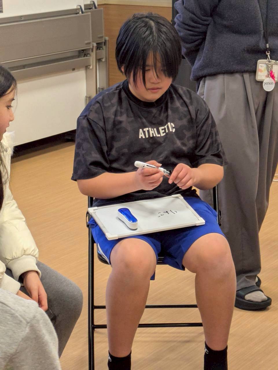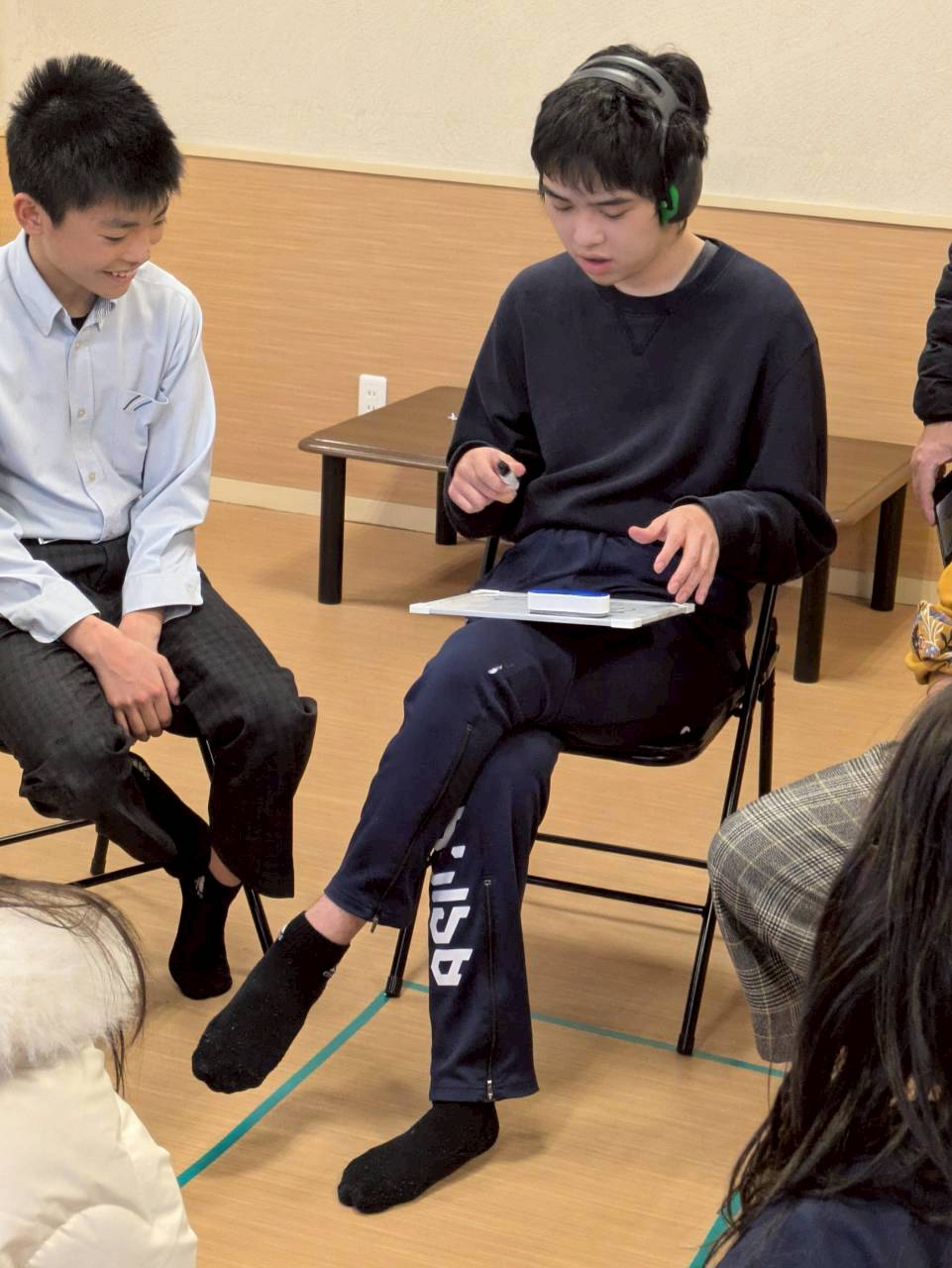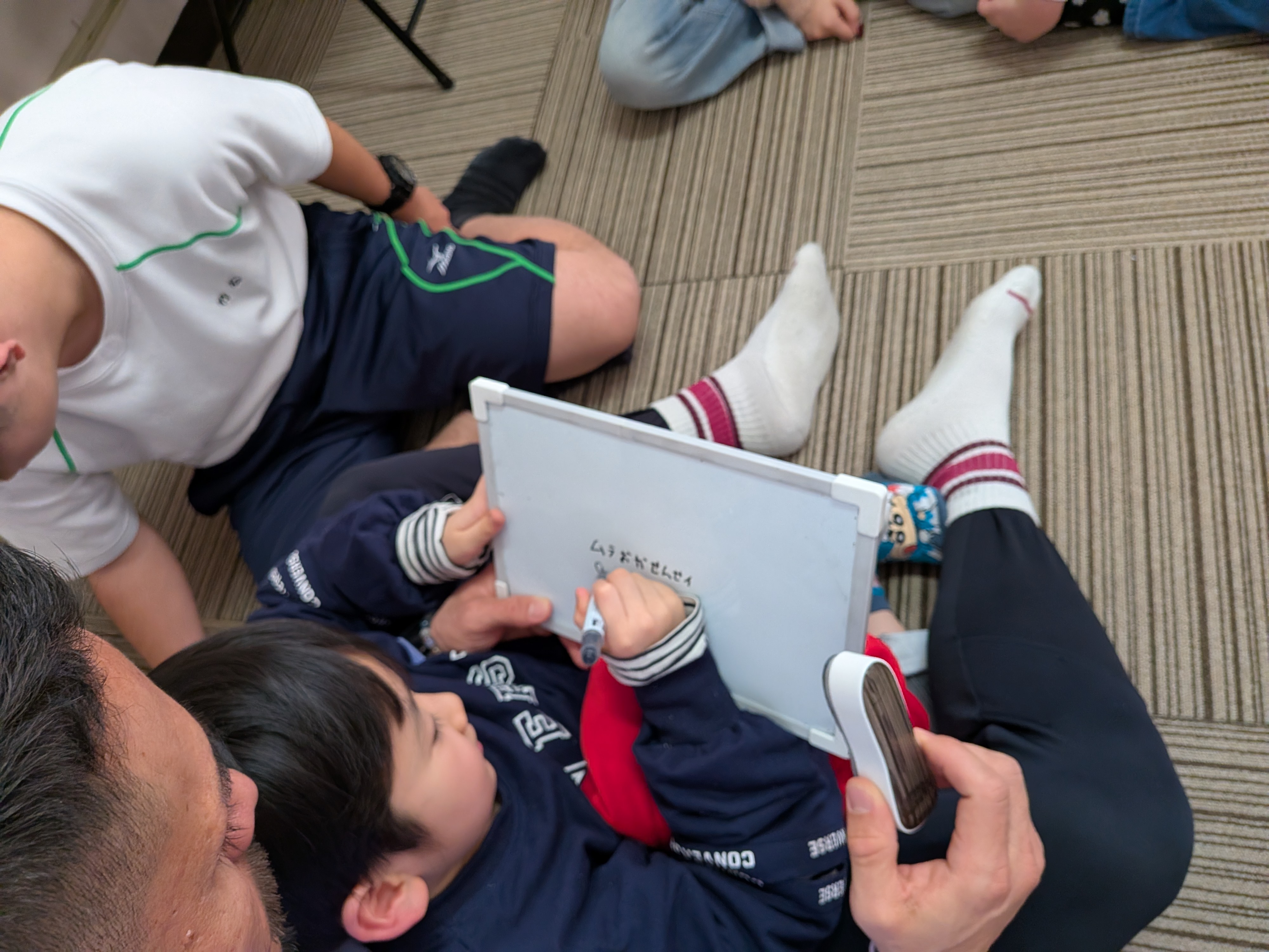前回した時は、ボ−ル⚽を爆弾💣️と見立ててしましたが、今回は小さいホワイトボードを使用して、お題にあった内容をボードに書いて言葉で伝えてから、隣の人に渡して行くようにしました😊