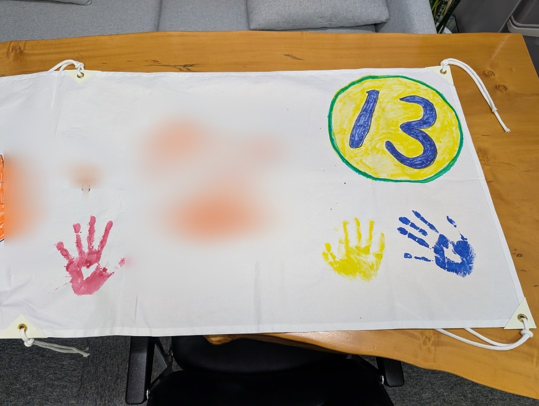 横断幕に手形をする為、スタッフから絵の具🖌️を塗ってもらいまして
