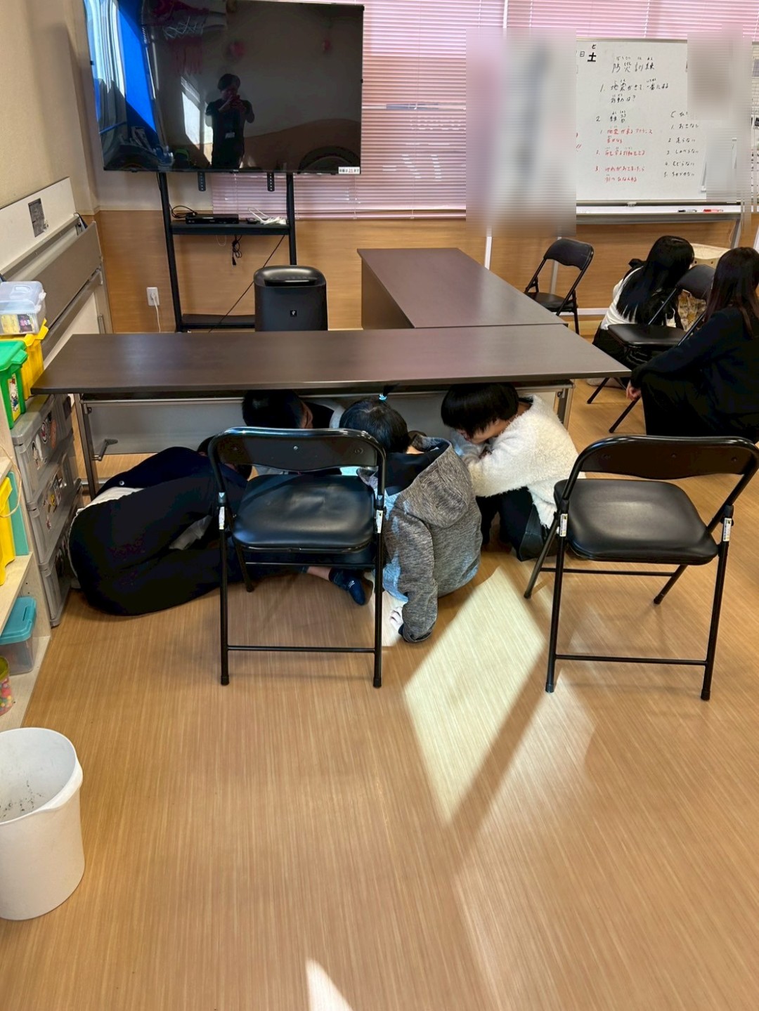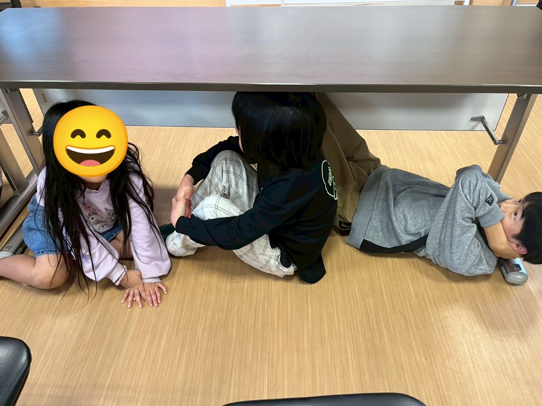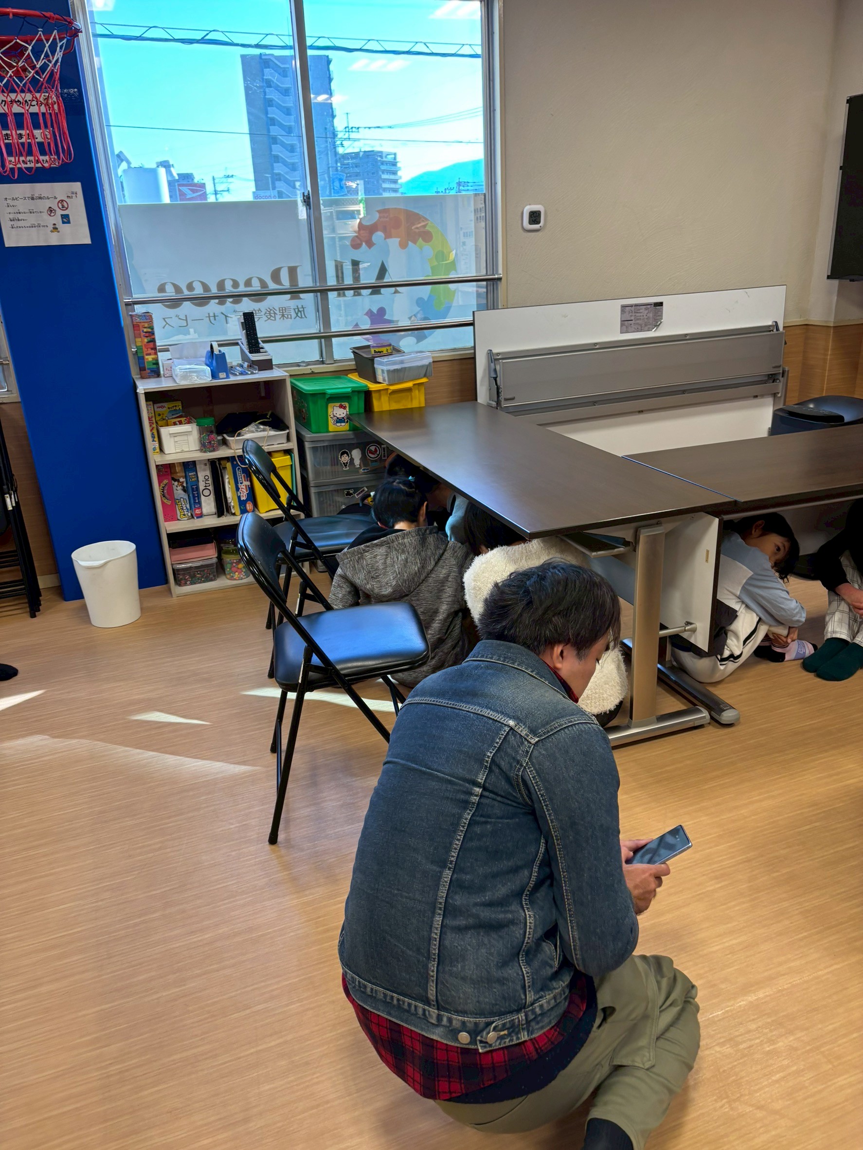 午後から、本番🙋地震発生のスピ-カ−🔊がなり、スタッフの指示に従って、落ち着いてテ−ブルの下や……荷物籠🧺を頭にかぶり、姿勢を引くして揺れがおさまるのを待ち…。スタッフ1名が火災🔥が発生してないかを確認し、火災がない事を確認取れたので、皆でゆっくり避難場所に向かいました🙋階段もスタッフが子ども達の間に入り…押さないように……ゆっくり階段をおりて…隣りのパチンコの駐車場へ避難しました🙋