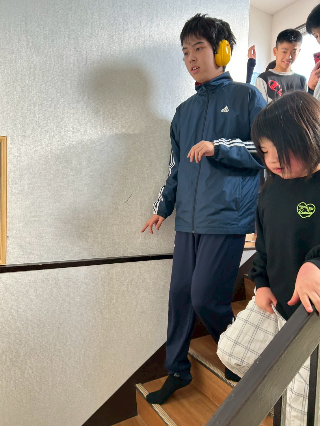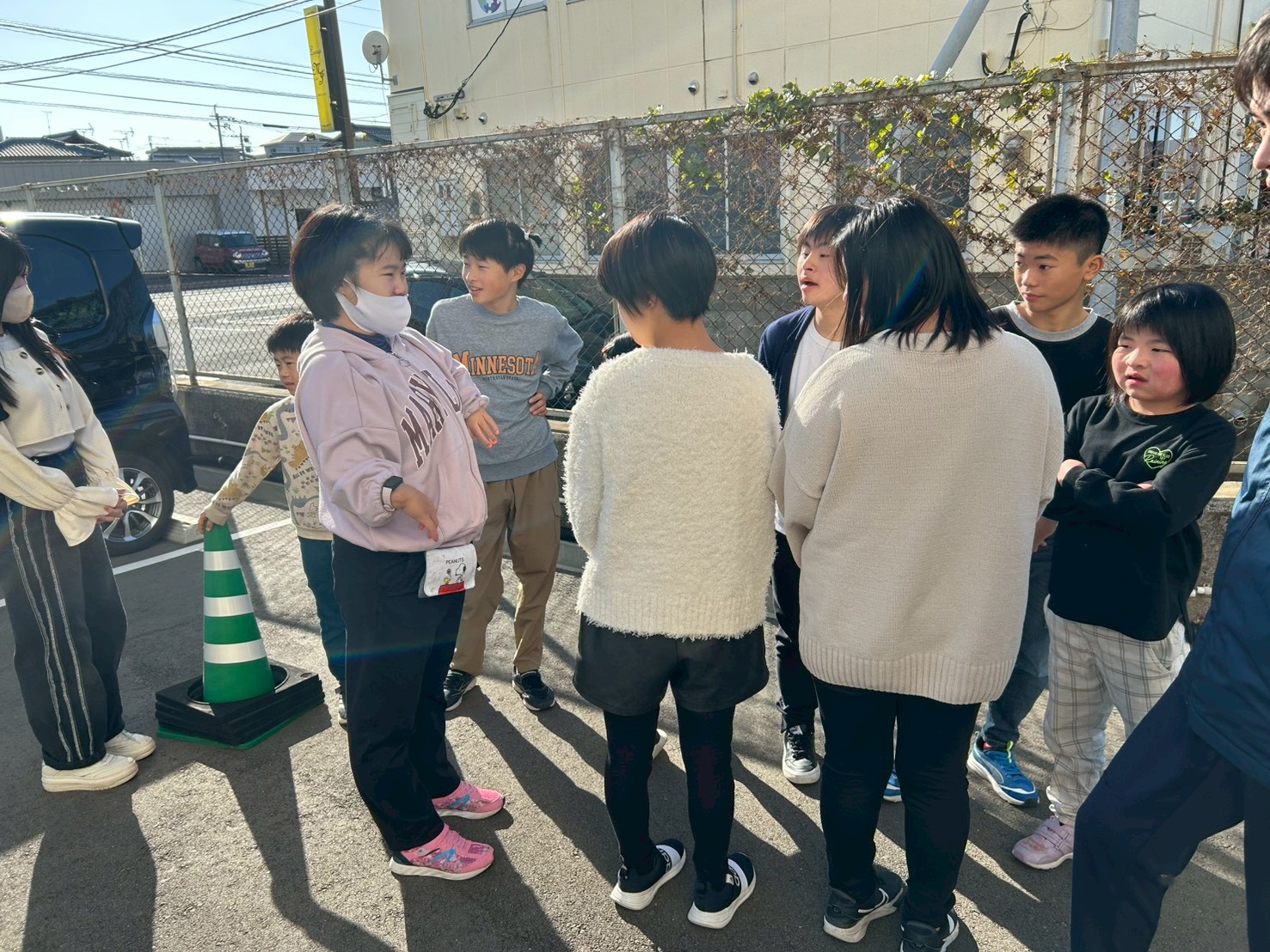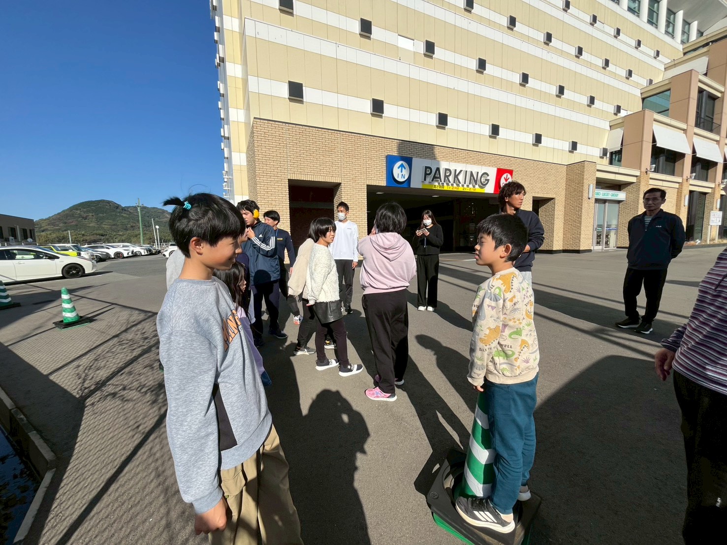午後から、本番🙋地震発生のスピ-カ−🔊がなり、スタッフの指示に従って、落ち着いてテ−ブルの下や……荷物籠🧺を頭にかぶり、姿勢を引くして揺れがおさまるのを待ち…。スタッフ1名が火災🔥が発生してないかを確認し、火災がない事を確認取れたので、皆でゆっくり避難場所に向かいました🙋階段もスタッフが子ども達の間に入り…押さないように……ゆっくり階段をおりて…隣りのパチンコの駐車場へ避難しました🙋